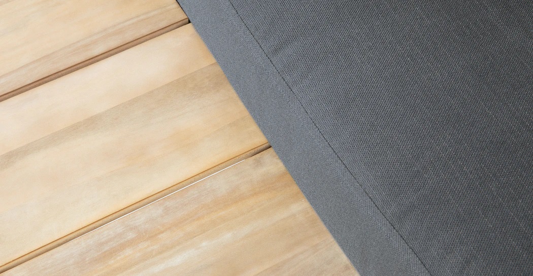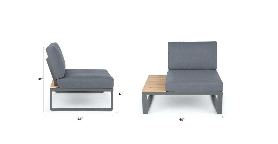 The Albufeira modular lounge corner set has a sleek anthracite aluminum frame with acacia light teak appearance. Includes black textilene accents and royal anthracite 240 cushions.