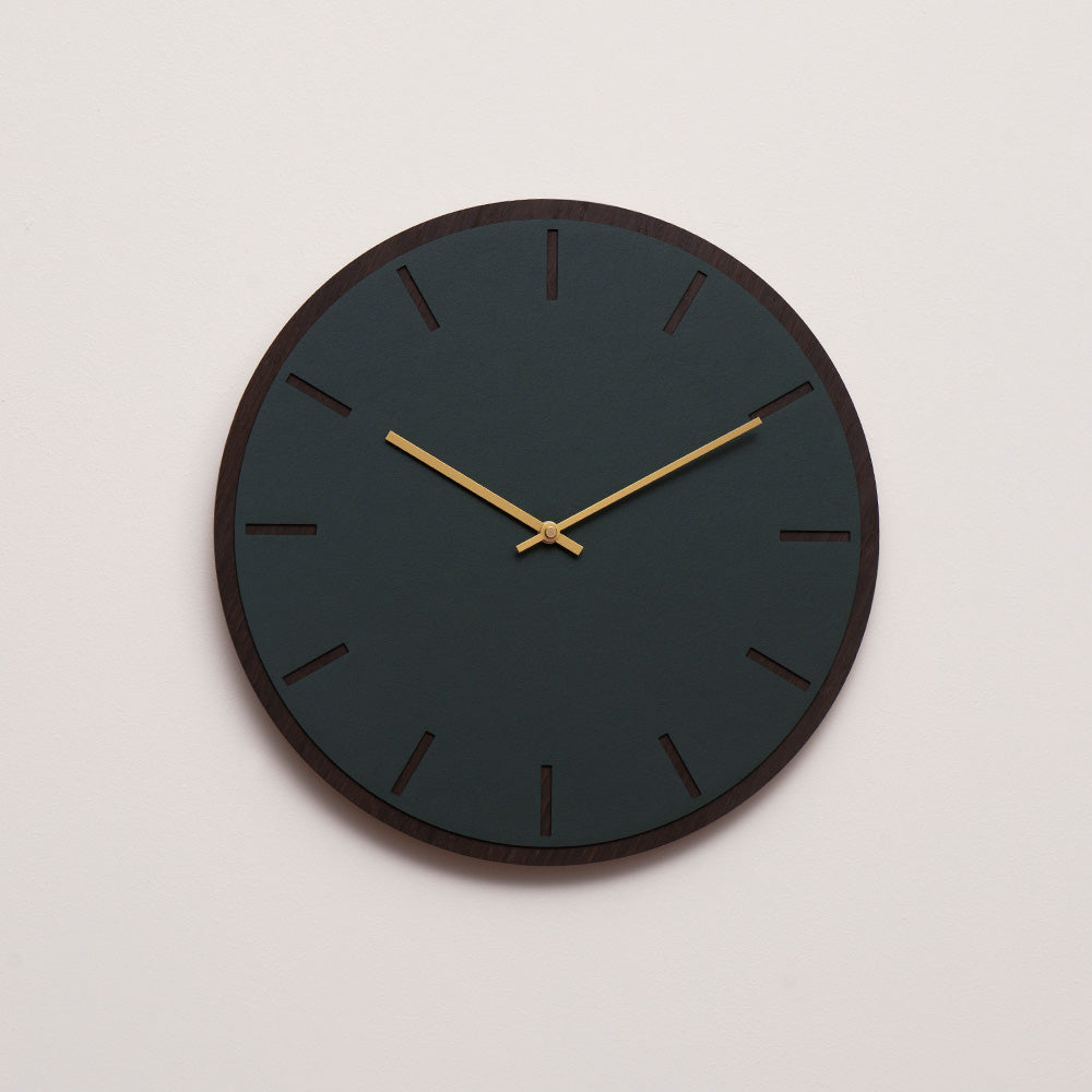 En basis van donker eikenfineer en een oppervlak van donkergroen linoleum met uitgesneden uurindicatoren benadrukken de discrete designstijl van de wandklok. Het minimalistische ontwerp past goed bij elk modern huis. Kies welke wijzers je wilt plaatsen, afhankelijk van hoe opvallend je ze wilt hebben op de wijzerplaat.