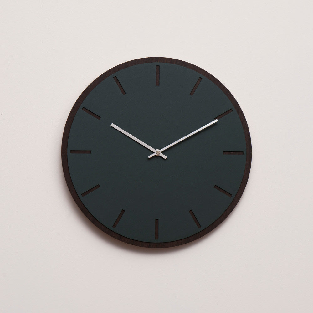 En basis van donker eikenfineer en een oppervlak van donkergroen linoleum met uitgesneden uurindicatoren benadrukken de discrete ontwerpstijl van de wandklok. De minimalistische uitstraling past goed bij elk modern huis. Kies welke wijzers je wilt gebruiken, afhankelijk van hoe opvallend je ze op de wijzerplaat wilt laten zijn.