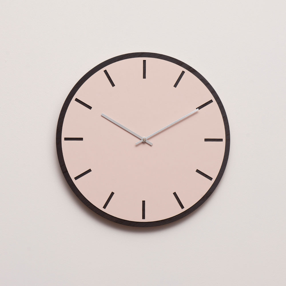 Een tijdloze, ronde wandklok met een minimalistische uitstraling. Het wijzerplaat is gemaakt van donker eikenfineer en bedekt met stoffig roze linoleum, wat zorgt voor een prachtig contrast en de uurmarkeringen duidelijk naar voren brengt. Pas het aan met je keuze aan wijzers om een wandklok te creëren die perfect past bij de moderne Noordse interieurstijl.