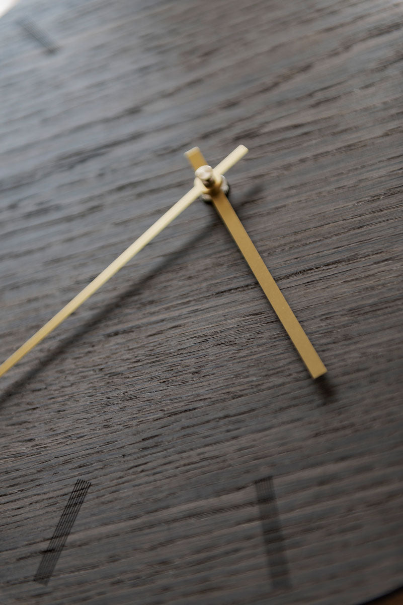 Een prachtige en eenvoudige wandklok met een ronde wijzerplaat, gesneden uit donker eikenhout. De jaarringen zijn duidelijk zichtbaar en variëren van klok tot klok, waardoor elk stuk uniek is. Het donkere hout van de klok past mooi in elk modern Noords huis en voegt karakter toe aan de muur. Je kunt zelf kiezen welke kleur wijzers je wilt combineren met het donkere hout, afhankelijk van hoe dominant ze moeten zijn.