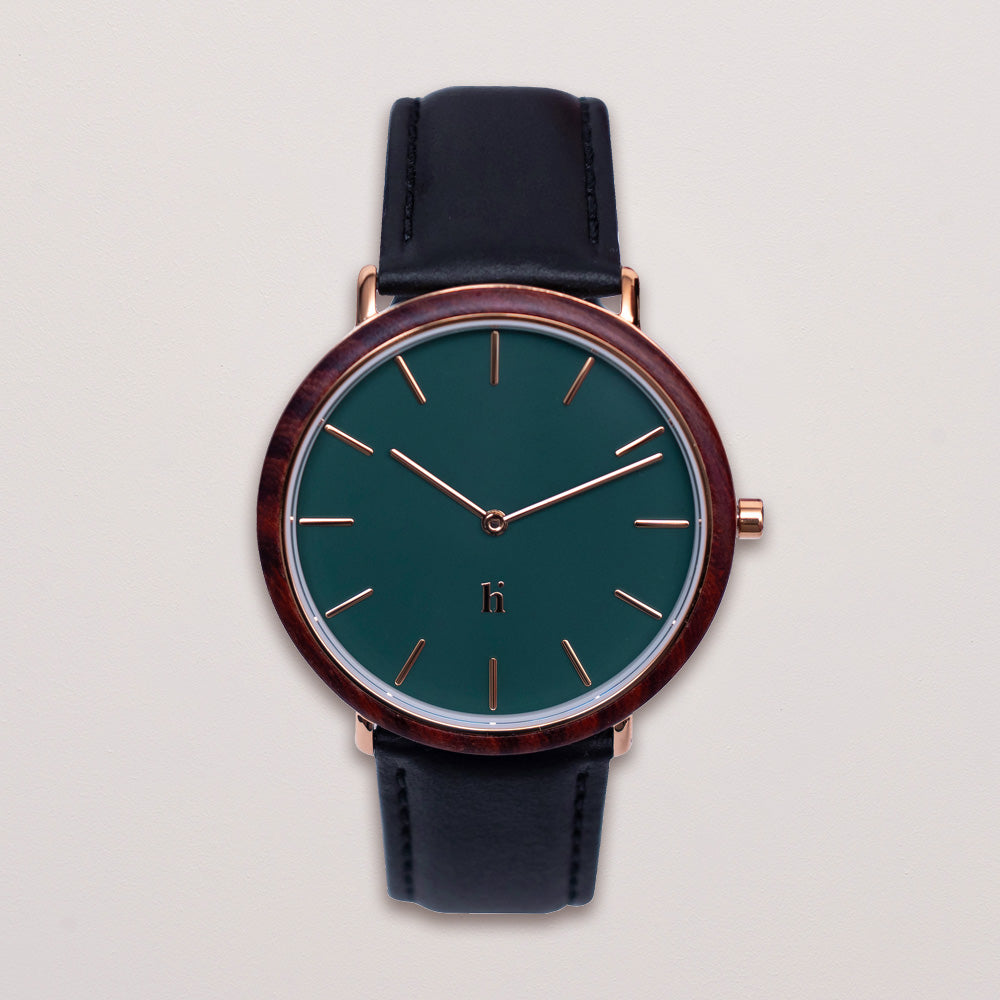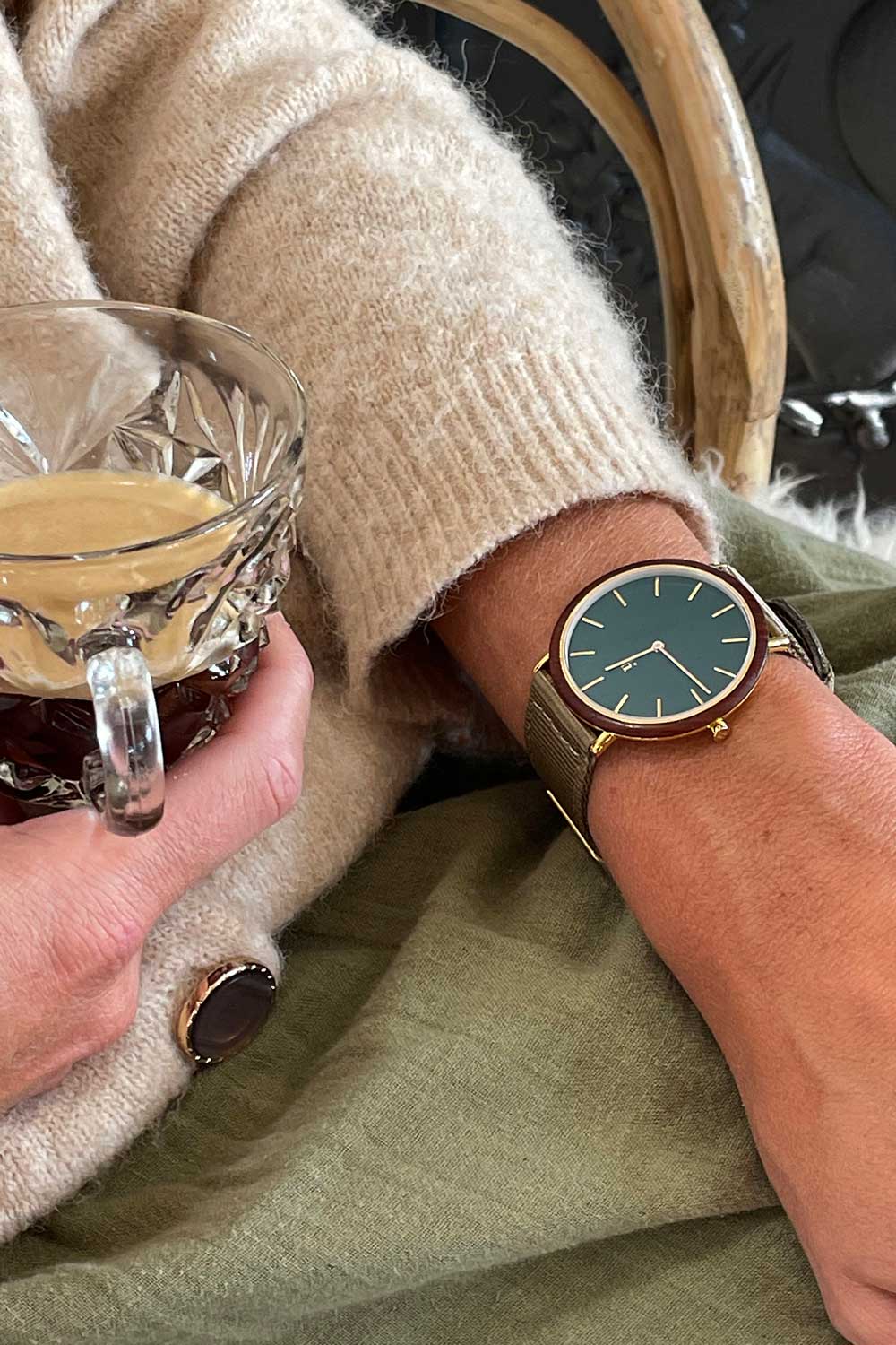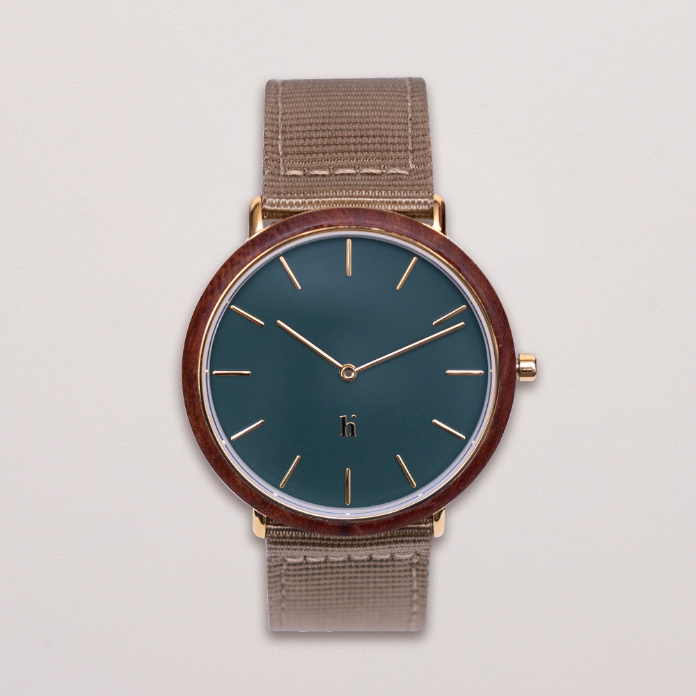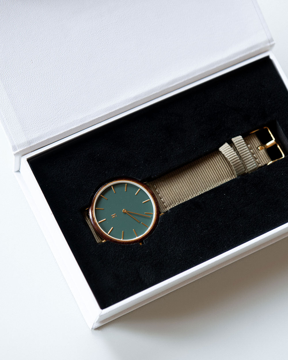 Een simpel en elegant uniseks horloge met een minimalistisch ontwerp dat perfect past bij de Scandinavische designstijl. De horlogekast is gemaakt van walnoothout en in combinatie met de donkergroene wijzerplaat geeft het horloge een uniek karakter. Combineer het met een horlogeband in je favoriete kleur en materiaal – kies uit zwart leer, vintage cognac leer of taupe nylon. De horlogeband is eenvoudig verwisselbaar, zodat je een extra band kunt aanschaffen en zo meer variatie aan je horloge kunt geven. Het horloge heeft een diameter van 40 mm en is waterbestendig (3 atm). Het uurwerk is Japans kwarts.