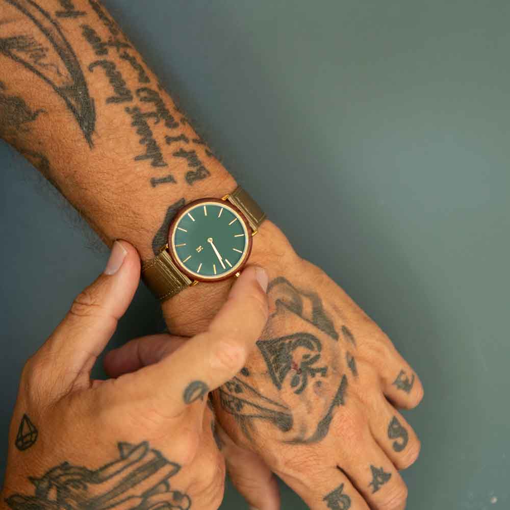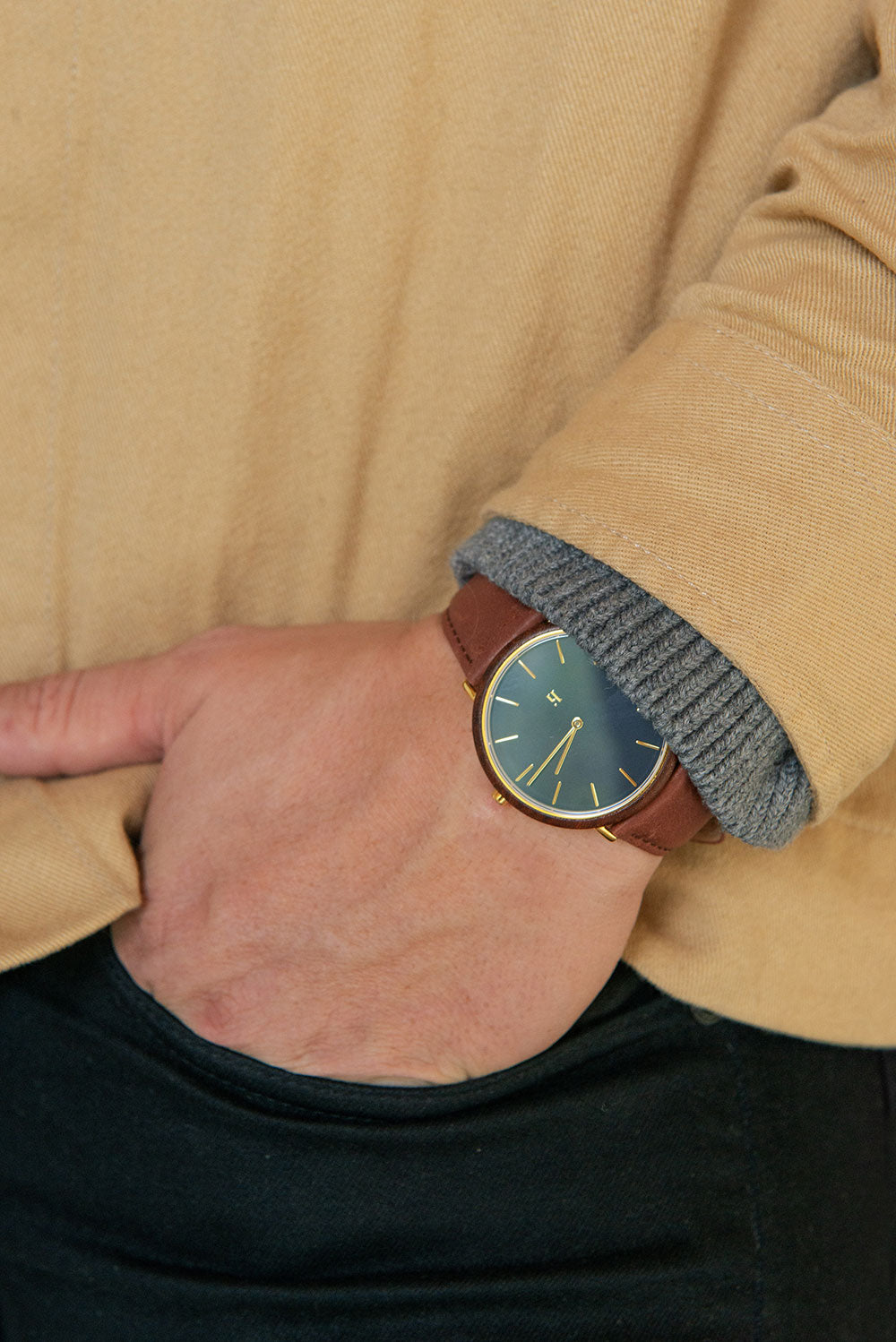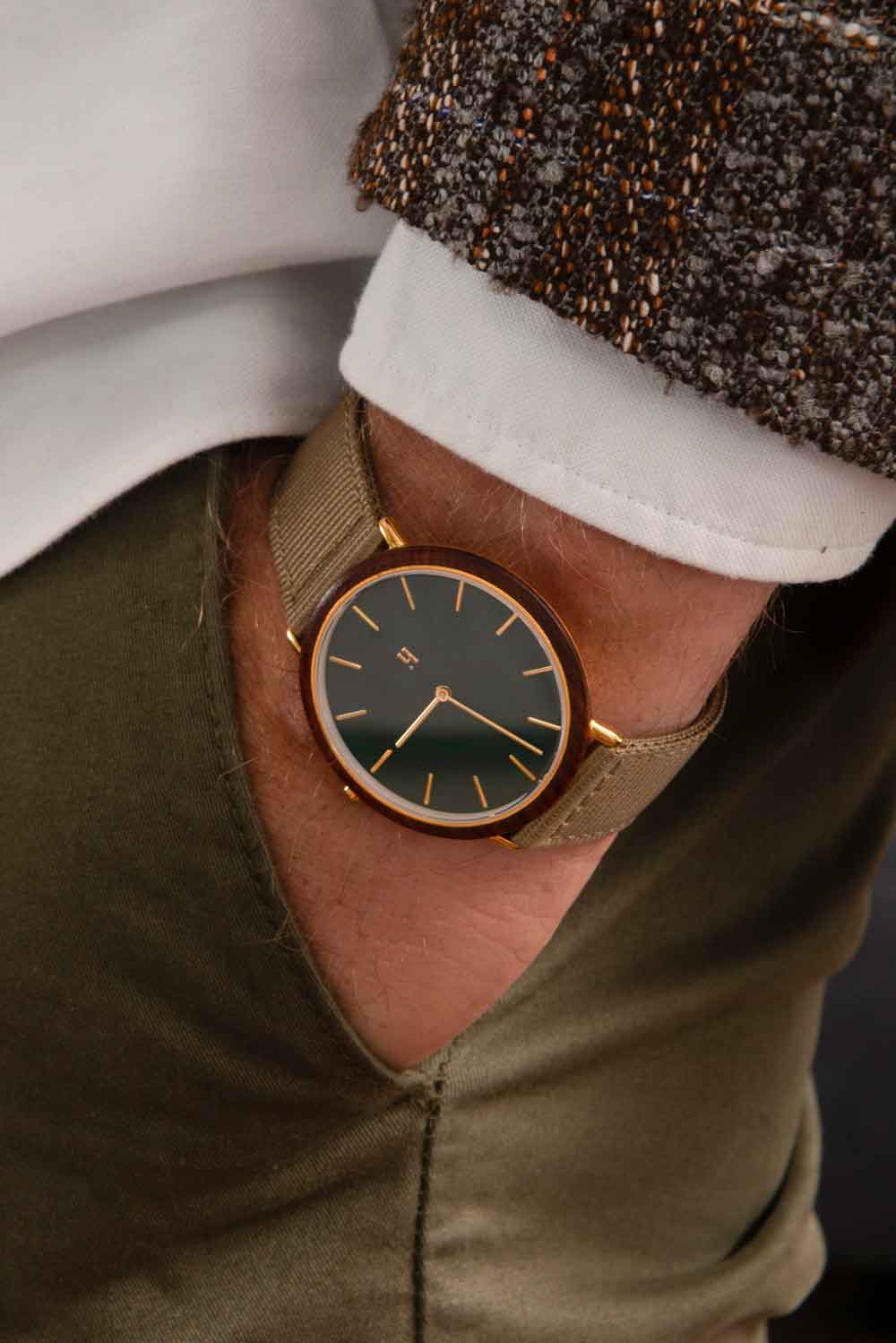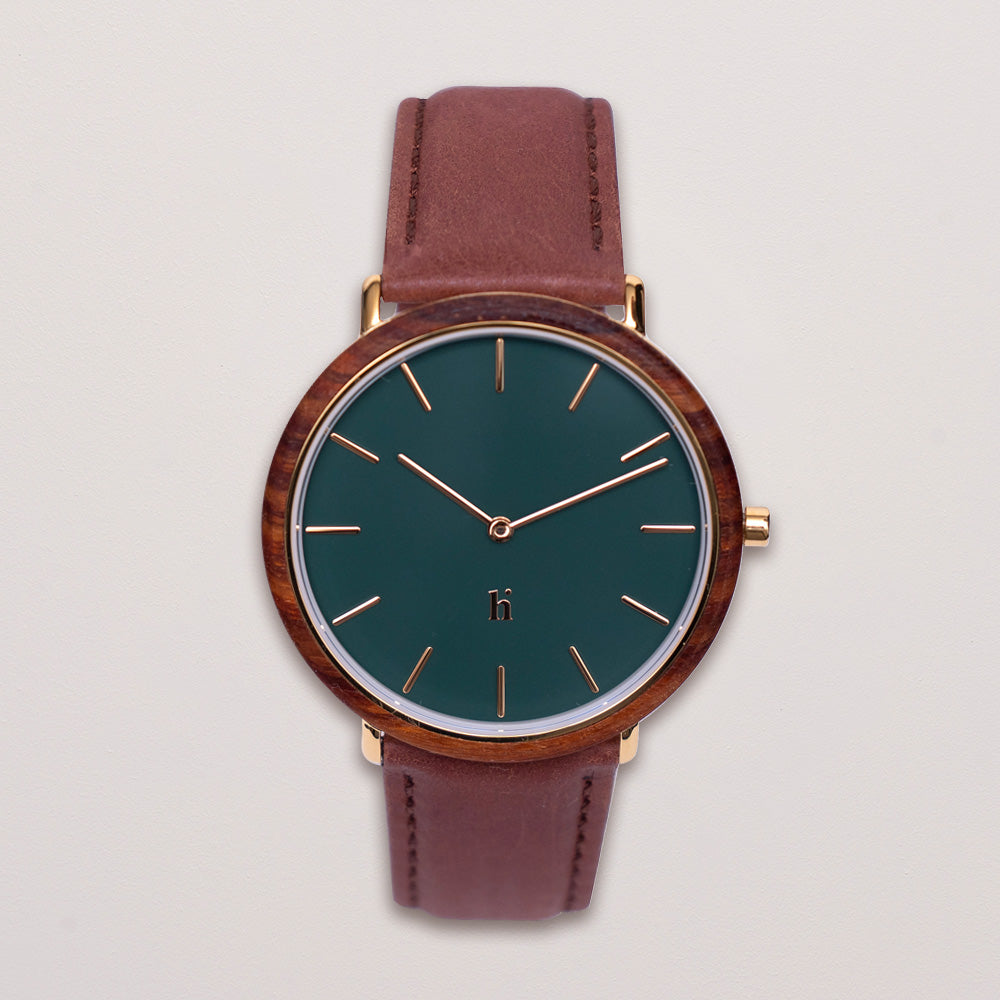 Een simpel en elegant uniseks horloge met een minimalistisch ontwerp dat perfect past bij de Scandinavische designstijl. De horlogekast is gemaakt van walnoothout en in combinatie met de donkergroene wijzerplaat geeft het horloge een uniek karakter. Combineer het met een horlogeband in je favoriete kleur en materiaal – kies uit zwart leer, vintage cognac leer of taupe nylon. De horlogeband is eenvoudig verwisselbaar, zodat je een extra band kunt aanschaffen en zo meer variatie aan je horloge kunt geven. Het horloge heeft een diameter van 40 mm en is waterbestendig (3 atm). Het uurwerk is Japans kwarts.