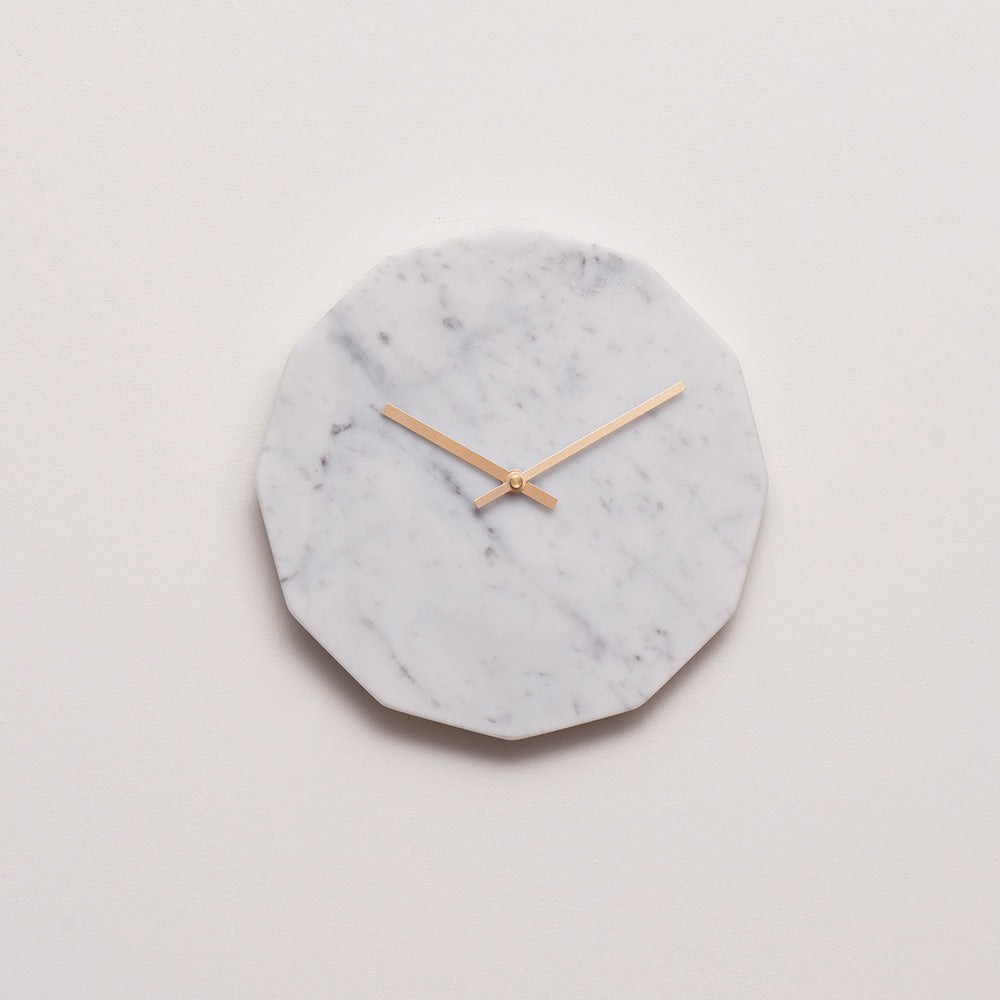 Een karakteristieke klok met een klassieke uitstraling. Het witte Bianco Carrara-marmer zorgt voor een lichte en neutrale look die prachtig in de Scandinavische interieurstijl past. De twaalfhoekige wijzerplaat dient als uurindicator, en het oppervlak varieert van klok tot klok omdat marmer een natuurlijk materiaal is. Kies donkere wijzers die goed opvallen op de lichte wijzerplaat of maak de wijzers meer subtiel door te kiezen voor licht zilver.