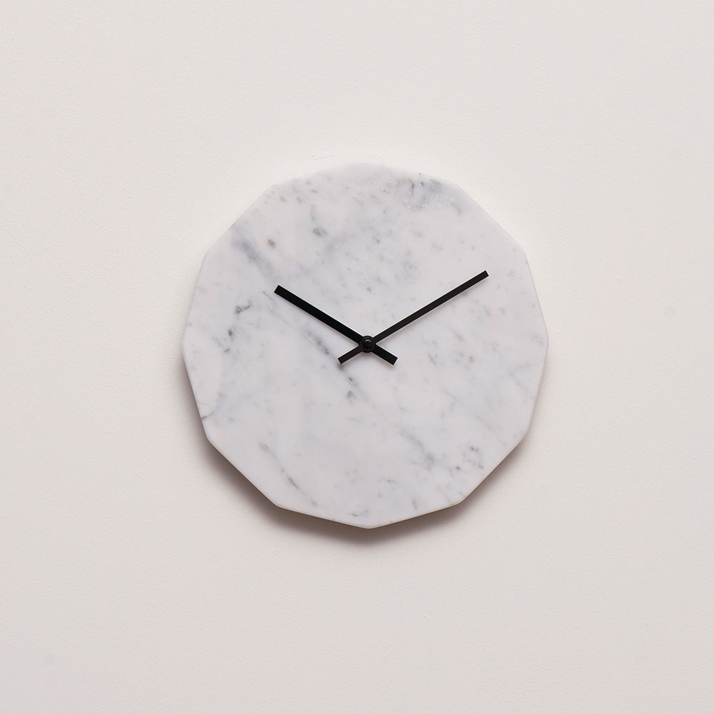Een kenmerkende klok met een klassieke uitstraling. Het witte Bianco Carrara-marmer geeft een lichte en neutrale look die prachtig past bij de Scandinavische interieurstijl. De twaalfzijdige wijzerplaat fungeert als uurindicator en de oppervlakte varieert van klok tot klok omdat marmer een natuurlijk materiaal is. Kies donkere wijzers die duidelijk opvallen op de lichte wijzerplaat of maak de wijzers minder opvallend door voor licht zilver te kiezen.