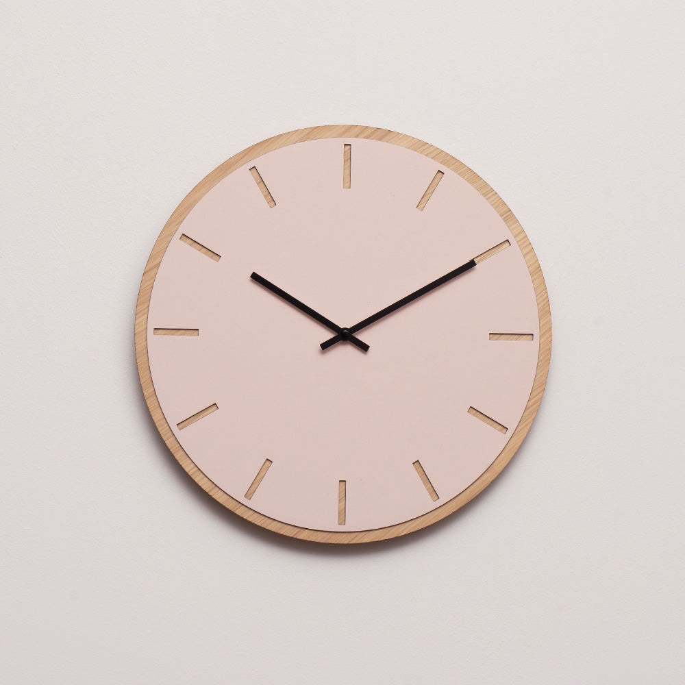 Een lichte, minimalistische en Scandinavische uitstraling. Het wandhorloge met zijn lichte eikenfineer achtergrond en het stoffige roze linoleumoppervlak met uitgesneden uurindicatoren belichaamt eenvoud. Kies bijpassende of contrasterende wijzers en laat ze het uiteindelijke uiterlijk van het horloge bepalen.