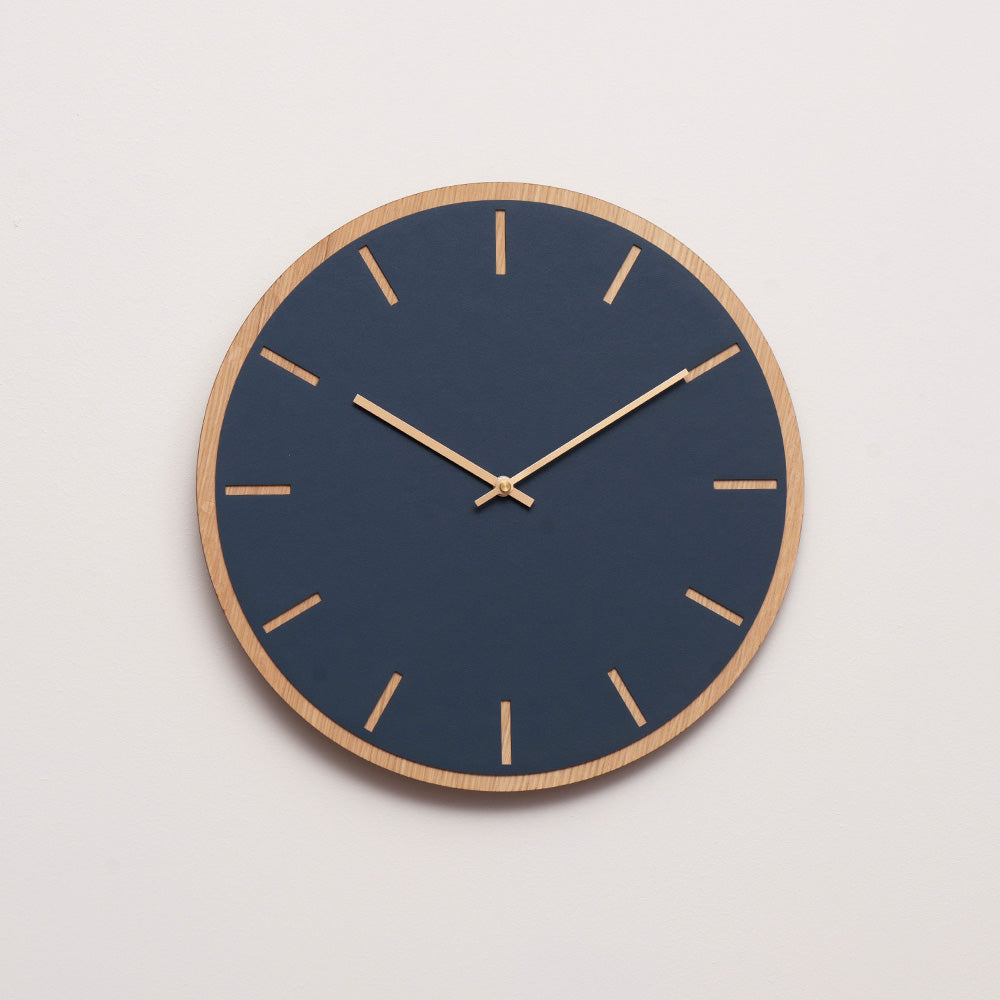 Det støvede blå vægur har en overflade af linoleum og en baggrund af lyst egetræsfinér, hvilket skaber et elegant mix af lyst og mørkt. De udskårne timeindikatorer fremstår tydeligt, og kombinationen med enten mørke eller lyse visere gør uret let at tilpasse til din indretningsstil.