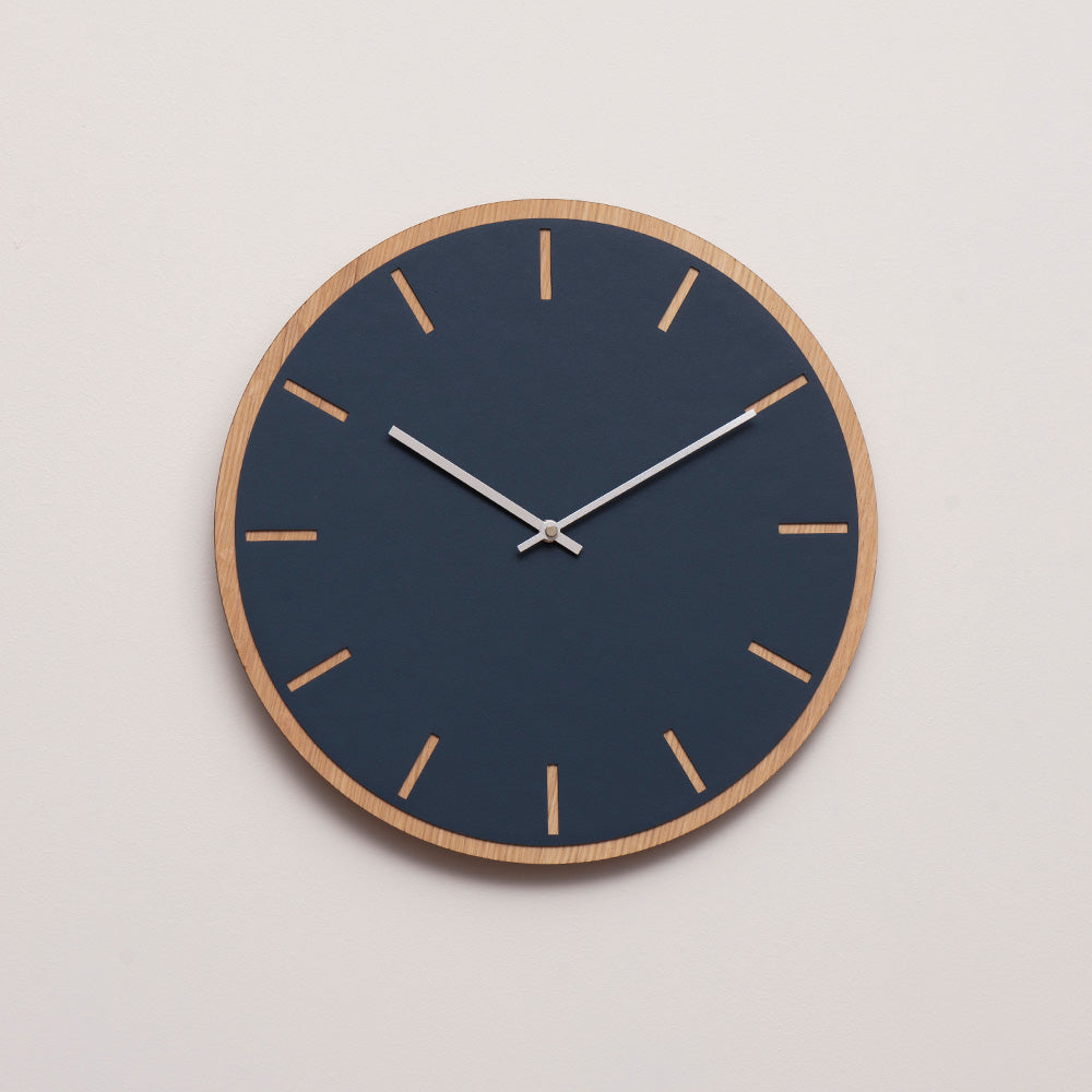 Det støvede, blå vægur har en elegant kombination af lyst egetræsfiner og en linoleumoverflade, der skaber en kontrast mellem lyse og mørke toner. De fint udskårne timeindikatorer står klart frem, og med valget mellem mørke eller lyse visere kan uret let tilpasses din personlige indretning.