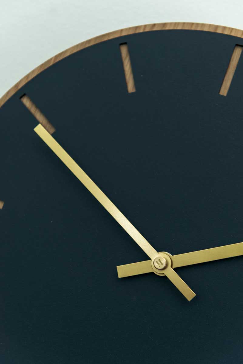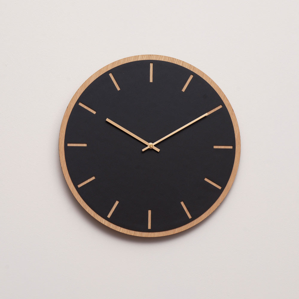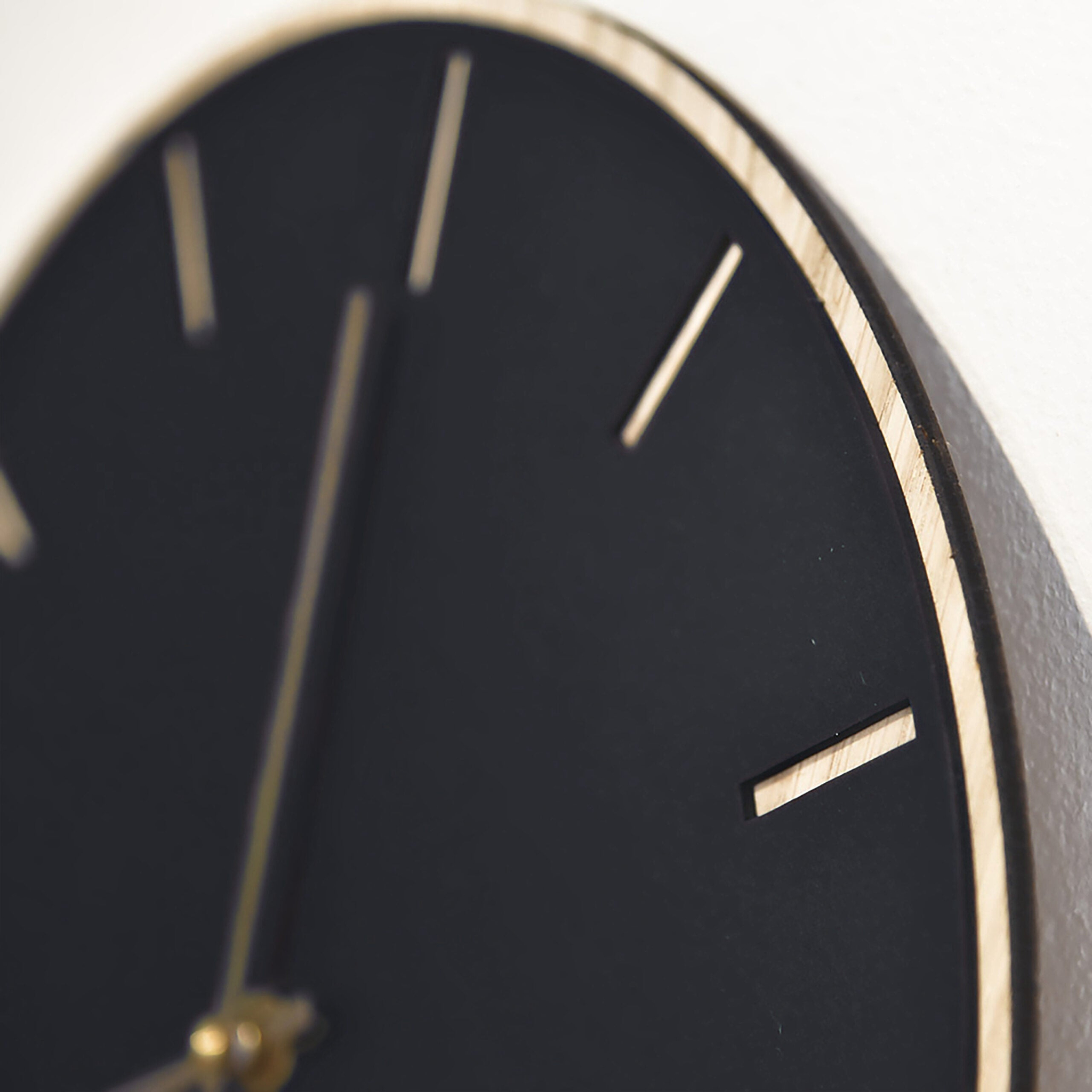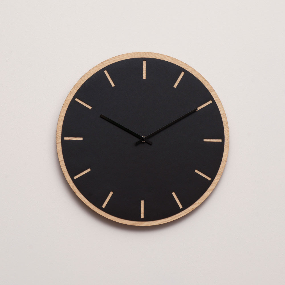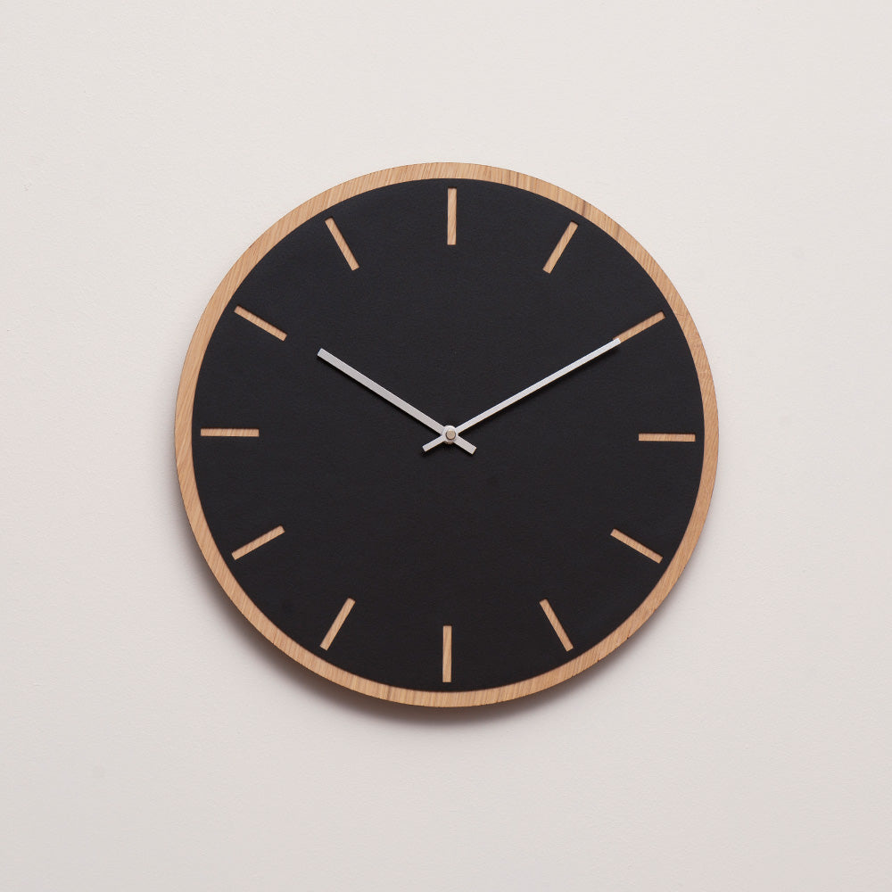Een eenvoudige en minimalistische wandklok in monochrome kleuren. Het lichte eikenfineer steekt scherp af tegen het zwarte linoleum met uitgesneden urenindicatoren, die extra duidelijk naar voren komen. Het klassieke ronde horlogegezicht in het zwart geeft een exclusieve uitstraling en kan worden gecombineerd met wijzers in goud en koper om het hout een warme uitstraling te geven, of met zwart of zilver om het meer ingetogen te houden.