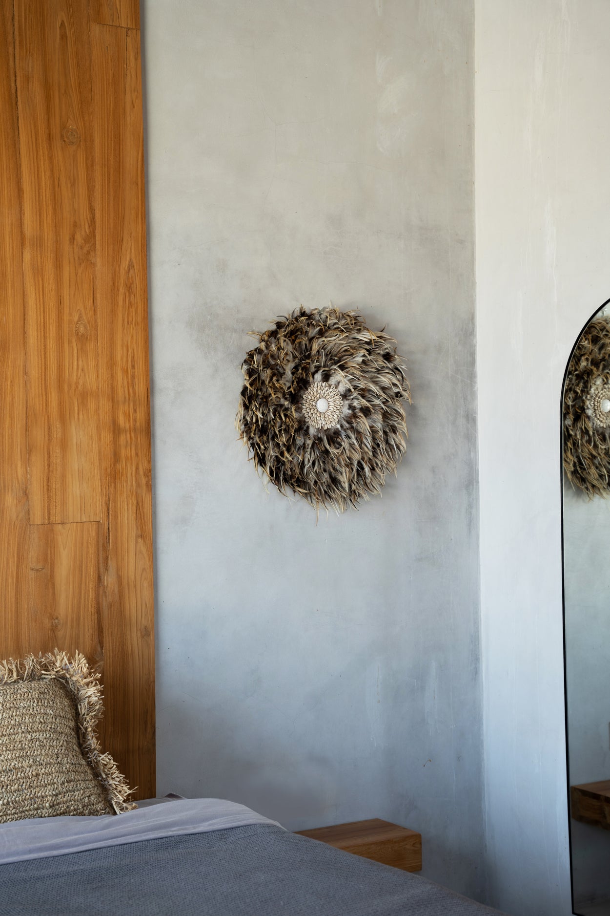 Our stunning gray-brown feather wall decoration is a true bohemian beauty to adorn any wall in your home interior, covered terrace, or garden. The central circle is surrounded by hand-placed shells.