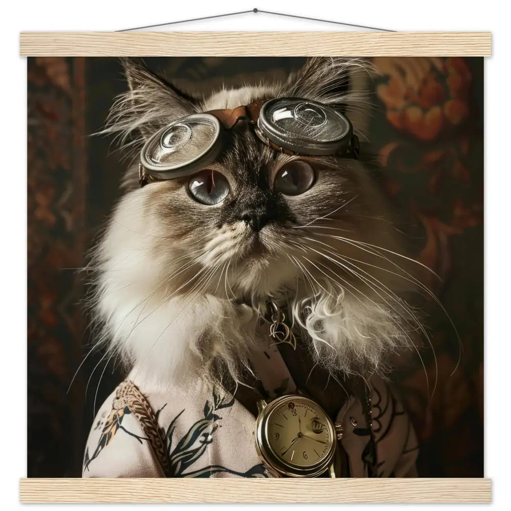 Dit schilderij toont een kat gekleed in een prachtige vintage steampunk outfit. Ze draagt een verfijnde, lichtroze jas met delicate bloemenpatronen en stijlvolle accenten. Om haar nek hangt een antieke gouden klok die haar elegante uitstraling compleet maakt. Haar kop is versierd met retro-futuristische brillen met zilveren metalen details, wat haar een avontuurlijke en mystieke uitstraling geeft. Haar pootjes hebben charmante witte bontachtige manchetten die het geheel afronden. De achtergrond toont een weelderig versierd bloemenbehang, waardoor de compositie een nostalgische en romantische touch krijgt.