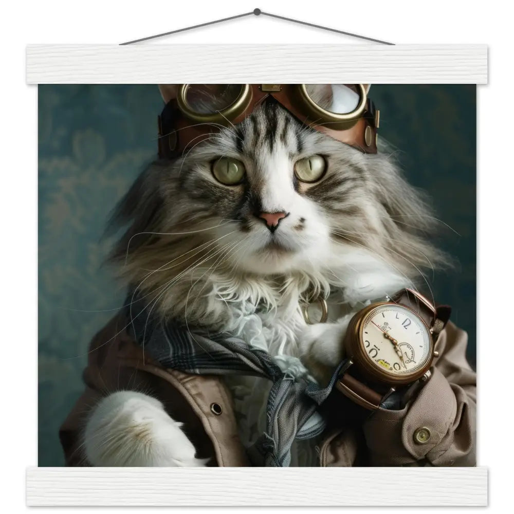Dit kunstwerk toont een prachtige kat gekleed in een vintage steampunk outfit. De kat draagt een elegante beige jas met subtiele patronen en koperen knopen. Hij heeft een antieke bronzen klok om zijn nek die zijn mysterieuze charme benadrukt. Op zijn hoofd draagt hij grote retro-futuristische brillen met metalen details, wat hem een intrigerende uitstraling geeft. Zijn poten zijn versierd met verfijnde ivoorkleurige manchetten, wat het geheel mooi afmaakt. De achtergrond van het schilderij heeft een gedetailleerd ornamentaal patroon dat perfect past bij de steampunk stijl en de outfit van de kat. Het is een exclusief stuk, waarvan slechts 200 exemplaren van elke maat beschikbaar zijn, waardoor de exclusiviteit ervan wordt gewaarborgd. Het materiaal van de afbeelding en de hangers is van hoge kwaliteit, met magnetische houten deuvels voor een vintage uitstraling. De poster is gedrukt op zwaar wit mat papier en wordt geleverd met aparte hangers die eenvoudig in elkaar te zetten zijn – geen ervaring vereist. De hangers zijn gemaakt van dennenhout, verkrijgbaar in verschillende kleuren en met katoenen touwen die passen bij de hangerkleur. De poster is duurzaam en slijtvast met een papiergewicht van 200 g/m². FSC-gecertificeerd papier en hangers worden gebruikt, wat beter is voor mens en milieu. Alles wordt stevig verpakt verzonden, zodat je zeker kunt zijn dat je bestelling in perfecte staat aankomt. De afbeelding is verkrijgbaar in verschillende formaten, waaronder 25×25 cm / 10×10″.