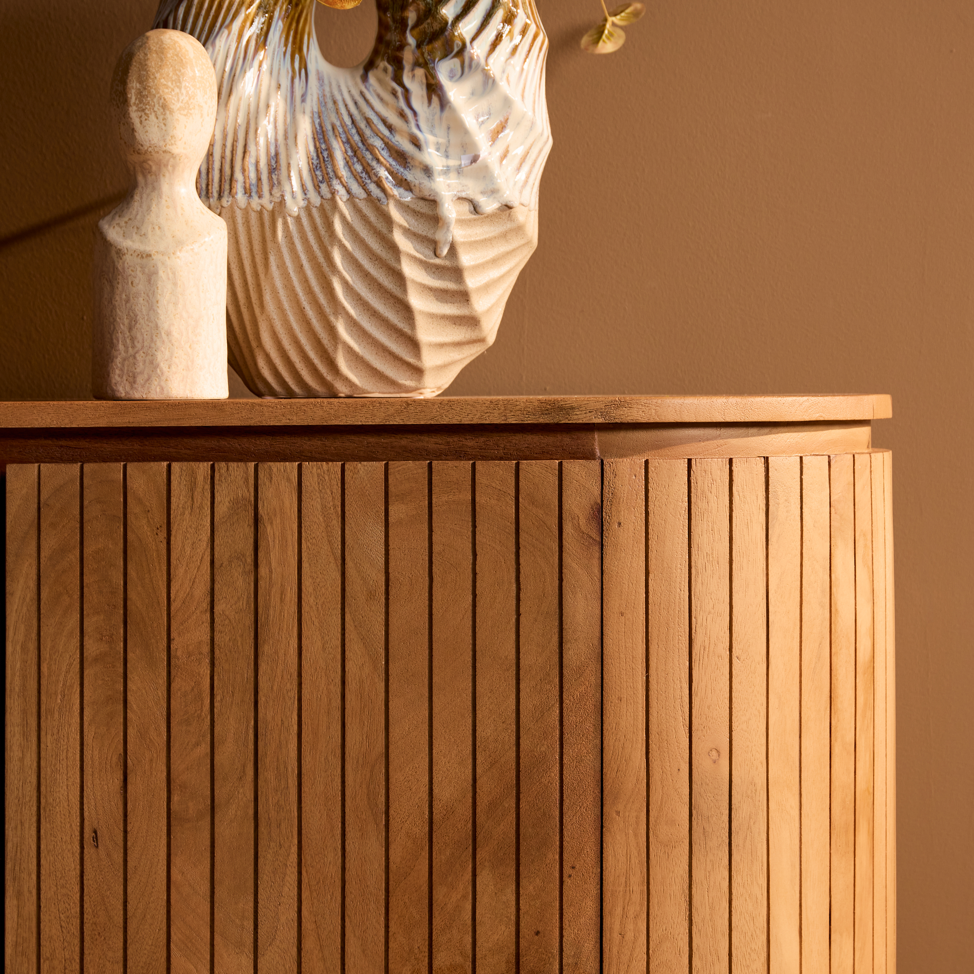 Dressoir Solana is een elegant en tijdloos meubelstuk met een eigentijds verticaal lattenpatroon. Met drie deuren biedt dit dressoir voldoende opbergruimte voor al je persoonlijke bezittingen. Het is de perfecte aanvulling op andere stukken uit de Solana collectie.