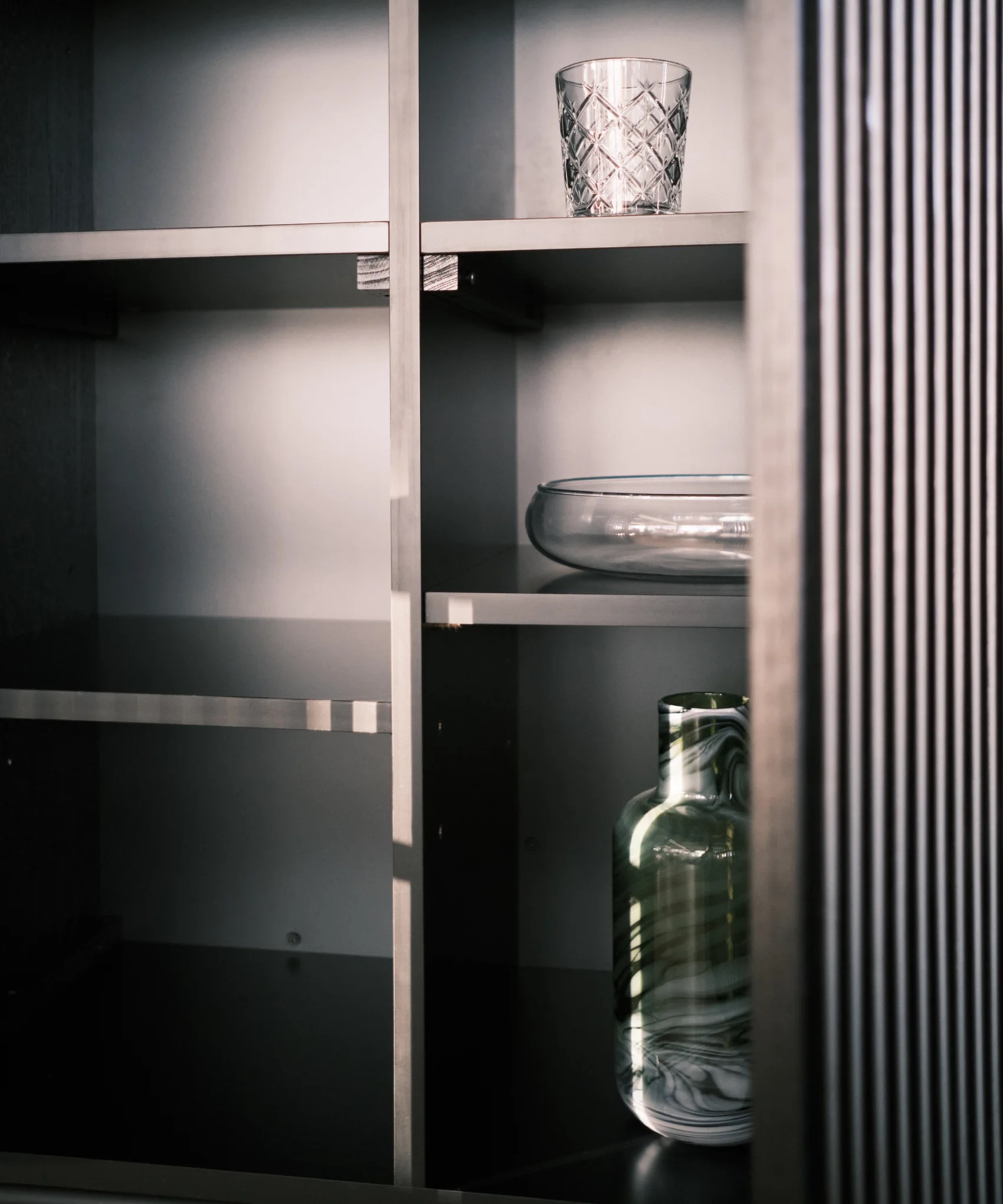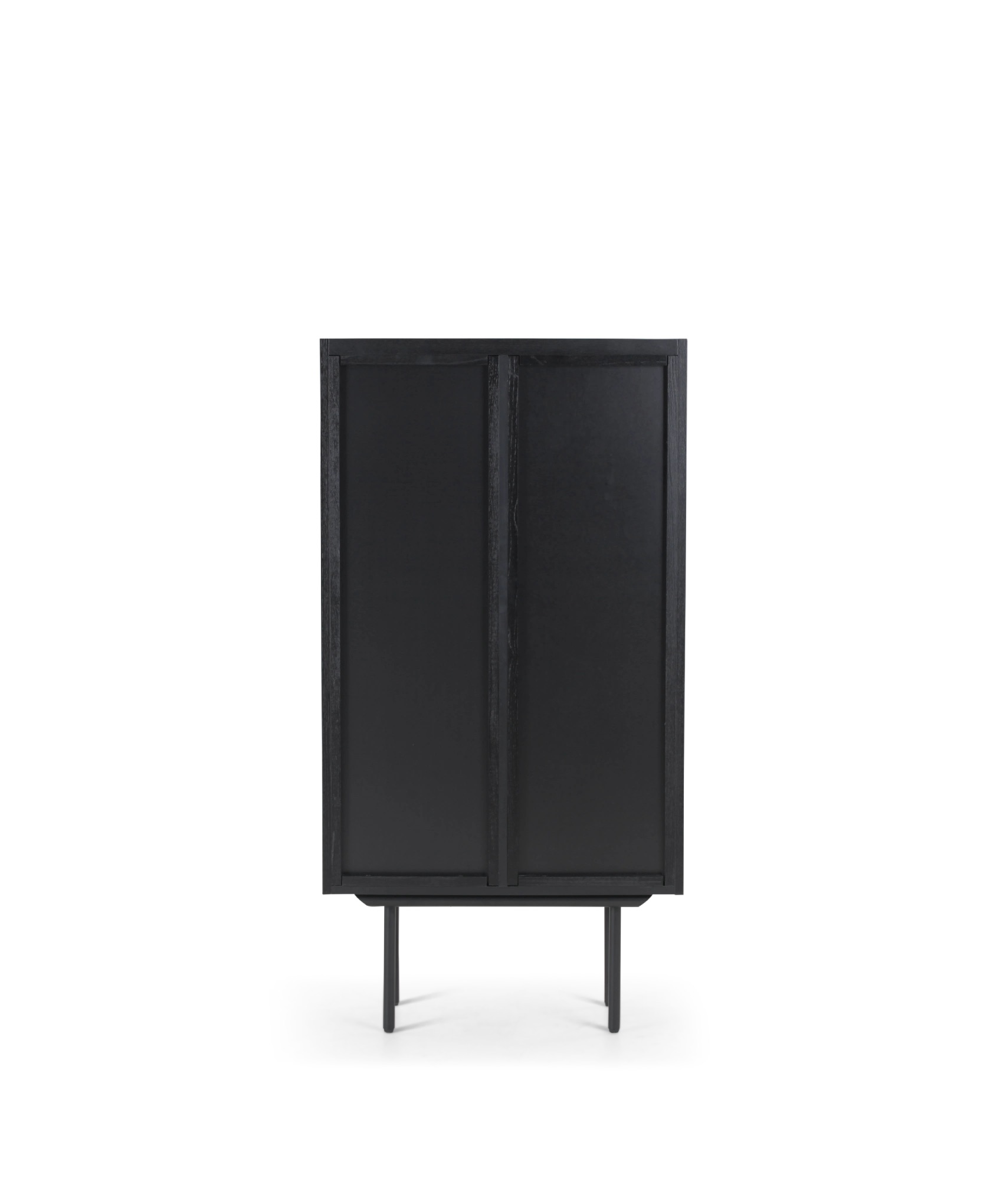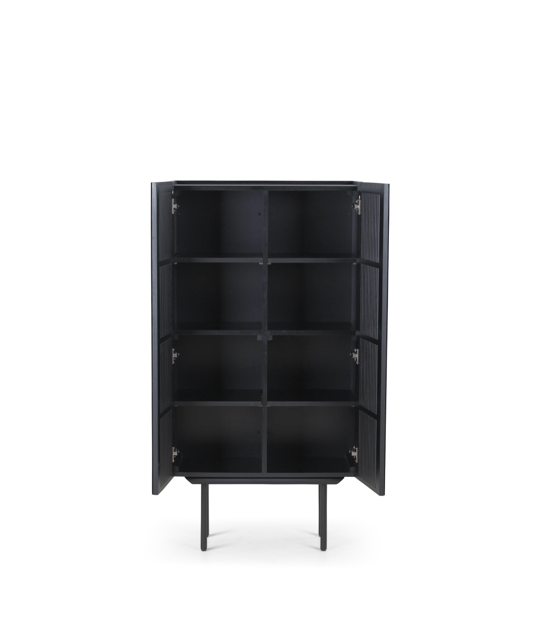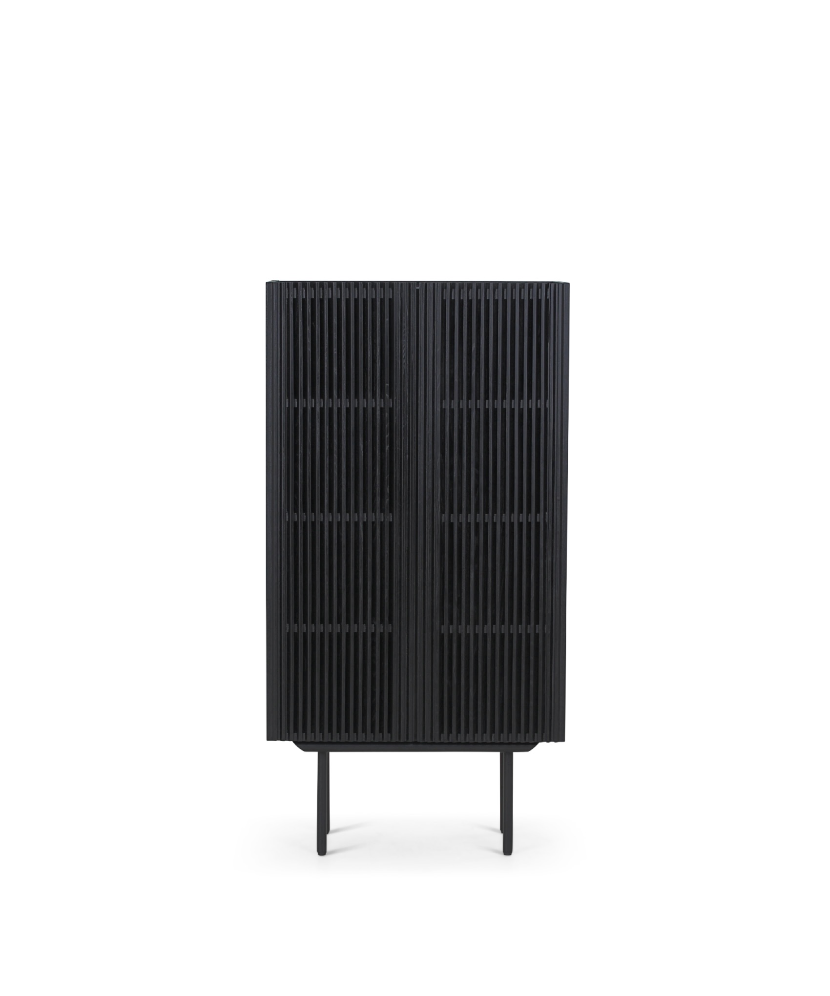 De Louvre-opbergserie is gemaakt met massief eiken latten, onder een hoek van 45° geplaatst. De schuine latten geven een subtiel inkijkje zonder alles prijs te geven. De iets verhoogde rand bovenop vormt een ideale plek om je favoriete woonaccessoires te tonen. De metalen pootjes zijn afgewerkt met matte zwarte poederlak, de kastombouw is MDF bekleed met bijpassende eikenfineer. Voorzien van softclose-scharnieren en verstelbare legplanken.