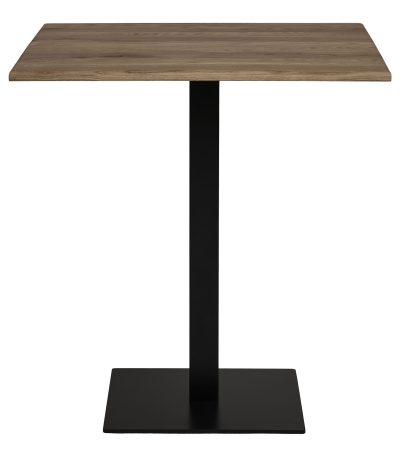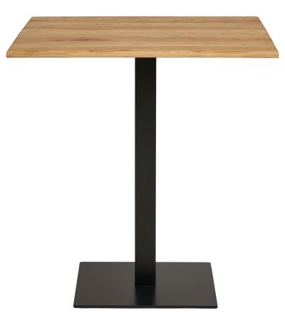 Tafel in een caféstijl, gemaakt van eikenhout met een strakke zwarte metalen basis, met afmetingen van 70x70x75 cm.