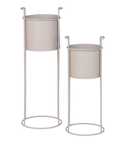“Twee stalen bloemenstandaarden met zand voor een stijlvolle plantendisplay”