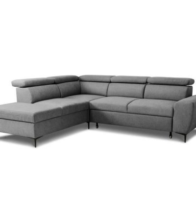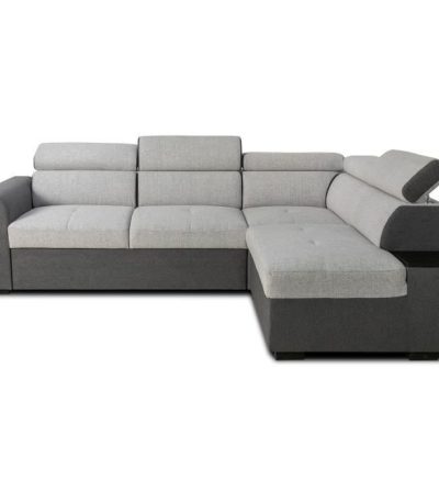 Reversible hoekbank – 4/5 plaatsen – KELIO – Antraciet/grijze stof – 3 hoofdsteunen – 245 x 184 x 77/87 cm