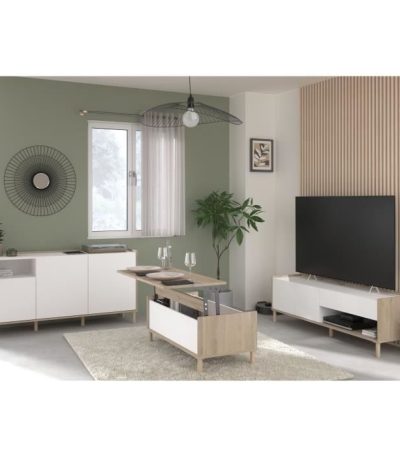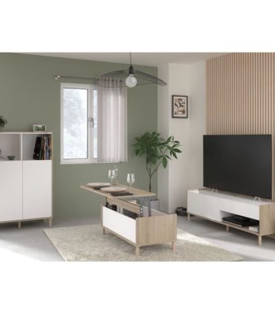 Woonkamermeubelset – tv-meubel, opklapbare salontafel, hoog dressoir – MORPHOS – Wit / Eiken decor – PARISOT