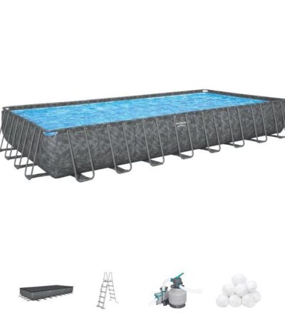 BESTWAY bovengrondse buisvormige zwembadset – APX 365 – 956 x 488 x 132 cm – Rechthoekig (zandfilter, 500g polysphere, ladder, afdekking)