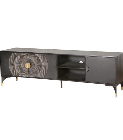 € 599,00Het TV dressoir van 190 cm uit de Sun Collection combineert opbergruimte en stijl perfect. Gemaakt van massief mangohout met Vintage Black finish, heeft het drie deuren en twee open vakken voor media-apparatuur en accessoires. Het zwarte, gepoedercoate metalen frame en antiek messing accenten geven een robuuste en luxe uitstraling.