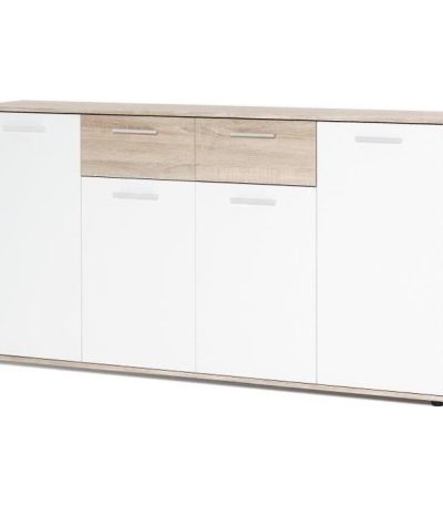 JACKY Laag dressoir – Wit melamine spaanplaat en eiken decor – Klassieke stijl en design – 4 deuren, 4 laden gemonteerd op metalen geleiders – 4 poten – Europese productie – Totale afmetingen B 160 x D 35 x H 85 cm.