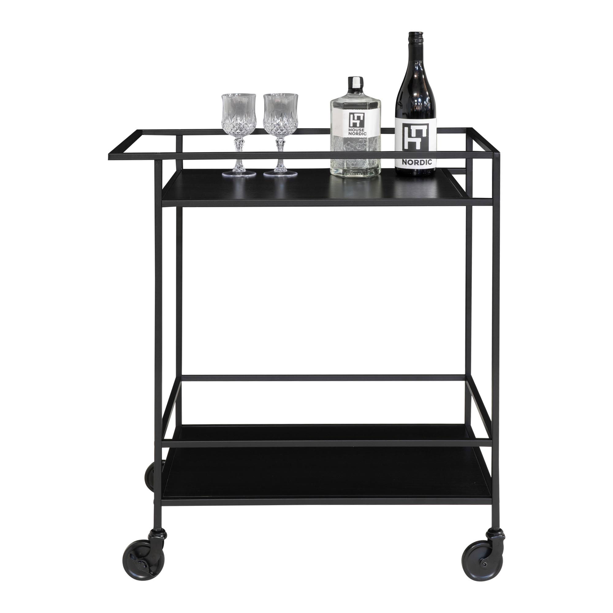 Zwart barkarretje met twee legplanken en een zwart frame. Strak en compact (68 x 40 x 79 cm) — perfect voor het serveren van drankjes of als extra opbergruimte in de woonkamer of keuken. Gemaakt van een stevig stalen frame met legplanken van spaanplaat afgewerkt met melaminefolie. Kleur: zwart. Afmetingen (L x B x H): 68 x 40 x 79 cm.