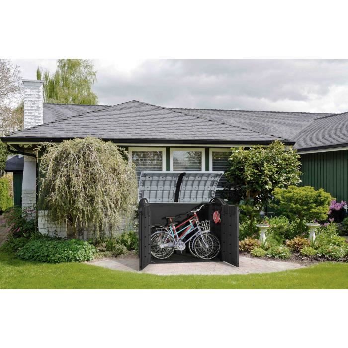 Tuinkist – Kunststofopslagbox – Ideaal voor het opslaan van allerlei buitenbenodigdheden zoals gereedschap en speelgoed – Houdt alles droog en beschermd – Bestand tegen alle weersomstandigheden – Uitgerust met twee deuren voor gemakkelijke toegang – Geschikt voor het opbergen van vuilnisbakken of zelfs fietsen – Ruime inhoud van 2000 liter – Verkrijgbaar in de kleur zwart.