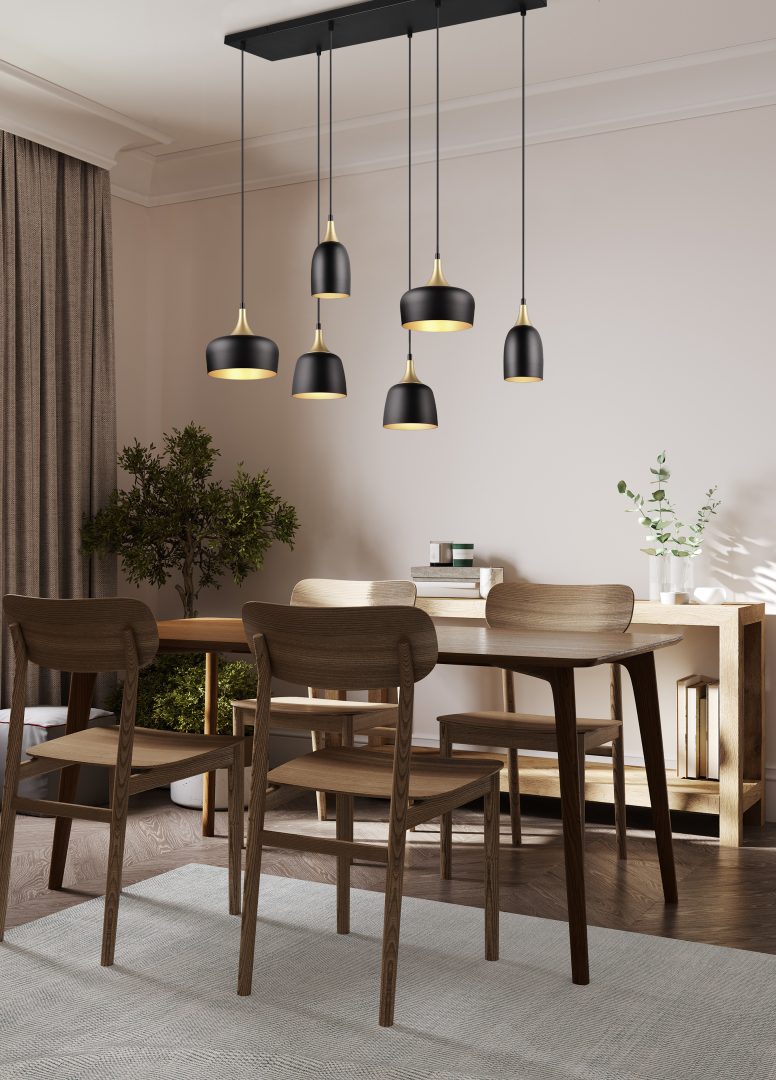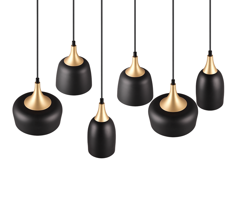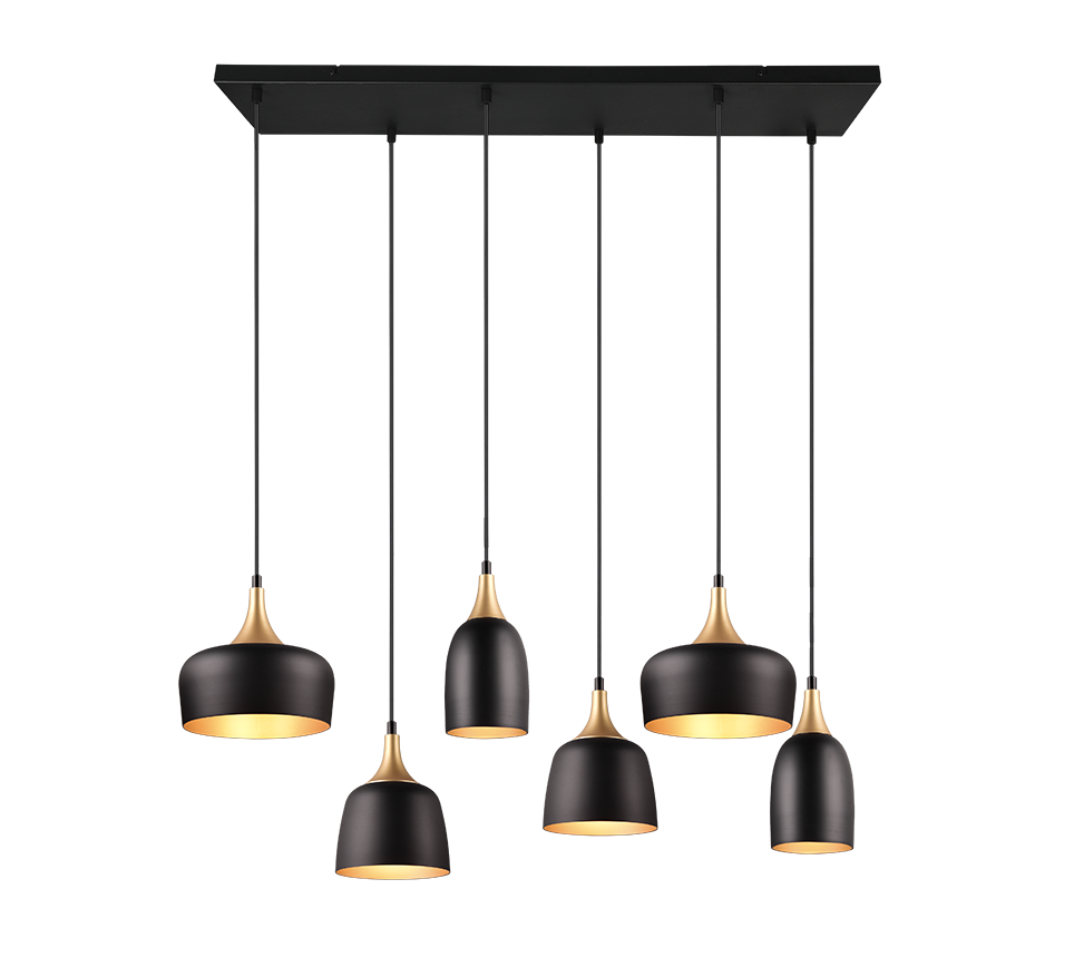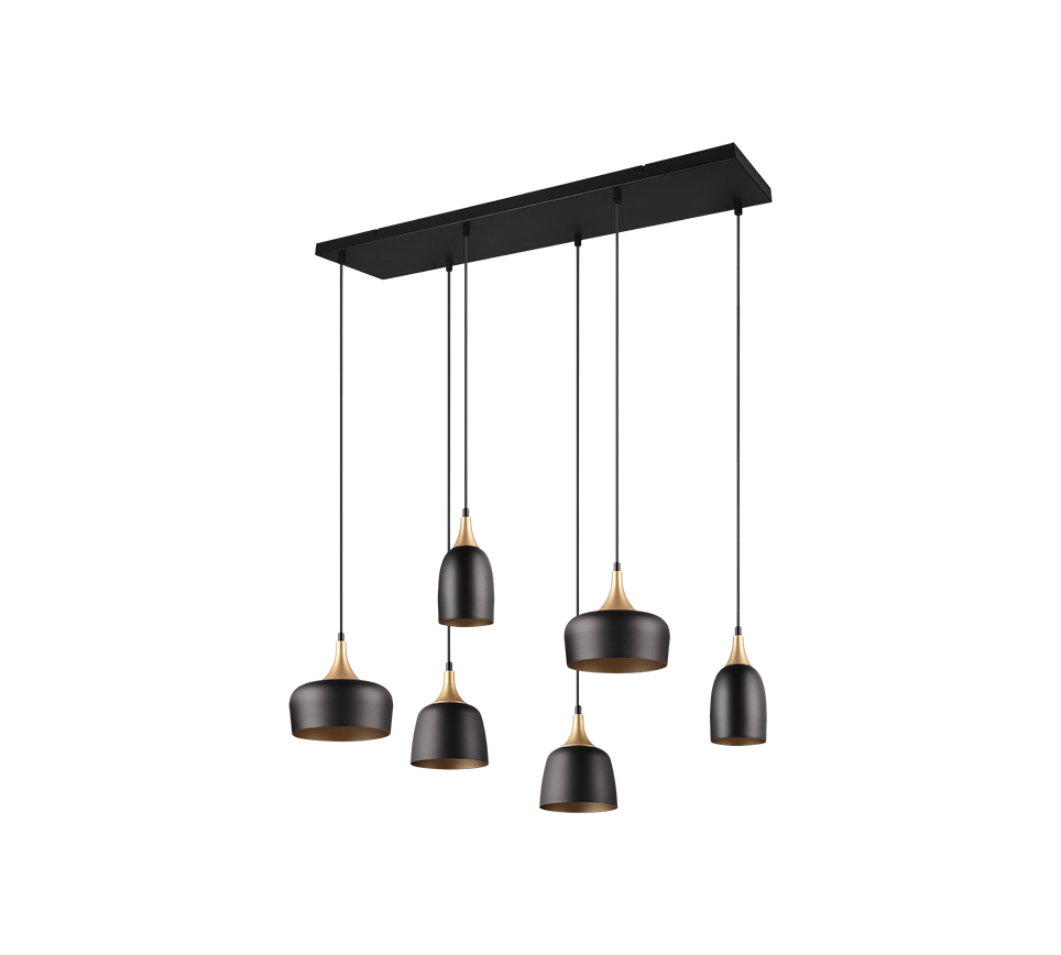De CHIRAZ hanglamp in verfijnde loft chic! De gouden accenten van het armatuur breken de harde stijl van de industriële look en geven de CHIRAZ een verfijnde charme. De verschillende vormen en hoogtes van de zes kappen maken van de lamp een decoratief element met een sterk karakter, dat ieders aandacht trekt boven een eettafel of aanrecht. Het elegante metalen ontwerp in mat zwart en messing creëert een sfeervolle ambiance en genereert de aandacht die het verdient binnen je vier muren. Het gebruik van LED lichtbronnen wordt aanbevolen voor energiebesparende verlichting. Deze vormen een ideaal alternatief voor conventionele halogeenlichtbronnen en bieden een hoge lichtkwaliteit en energiebesparingen tot 80%. Met LED lichtbronnen profiteert u ook van een lange levensduur en een lage warmteontwikkeling, terwijl het milieu wordt beschermd.