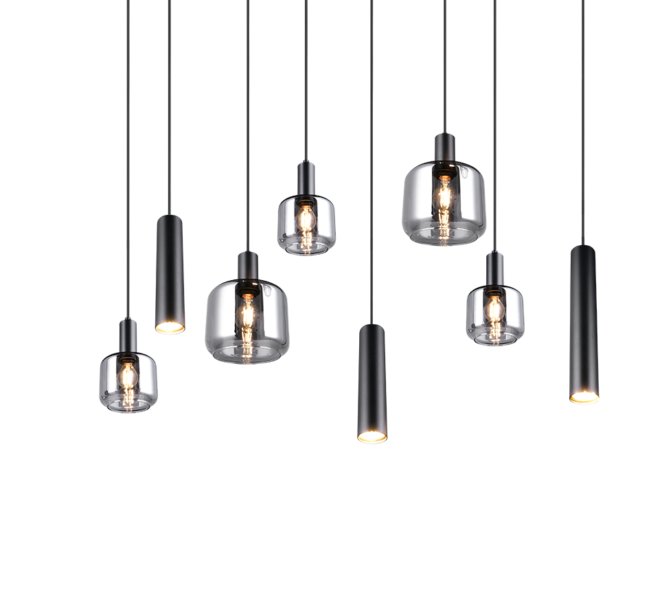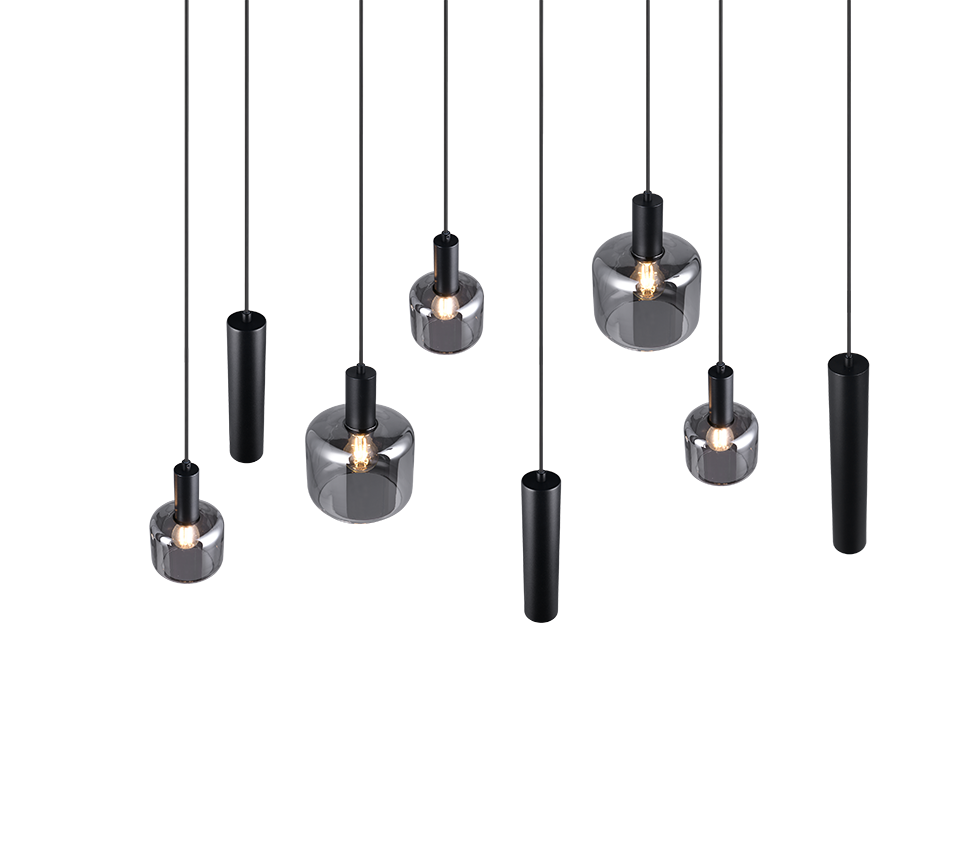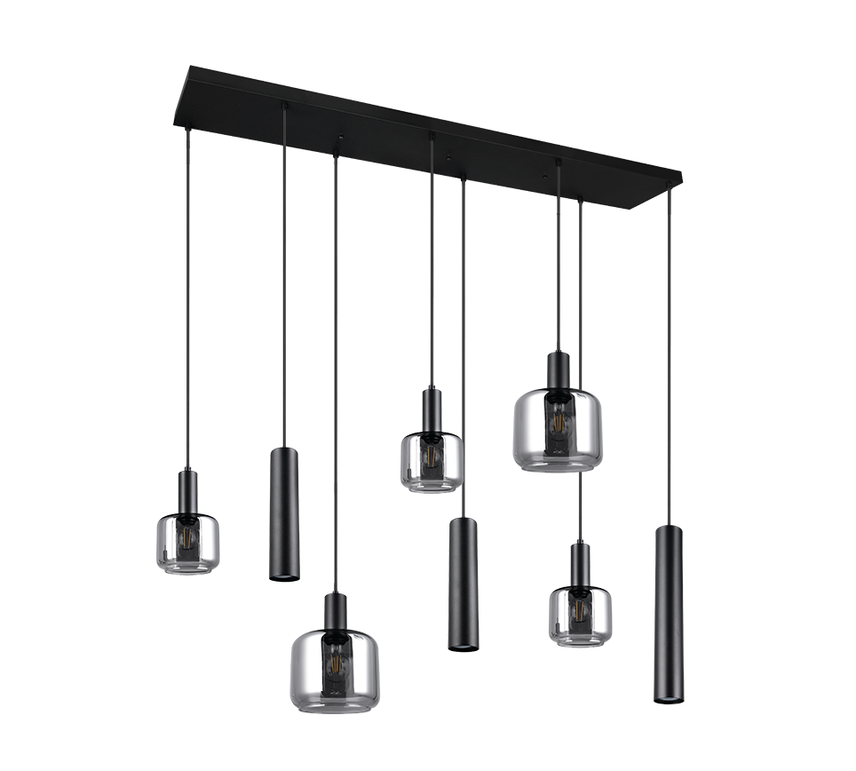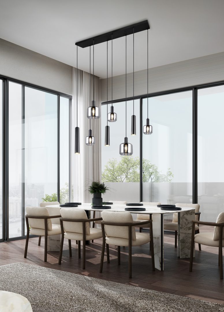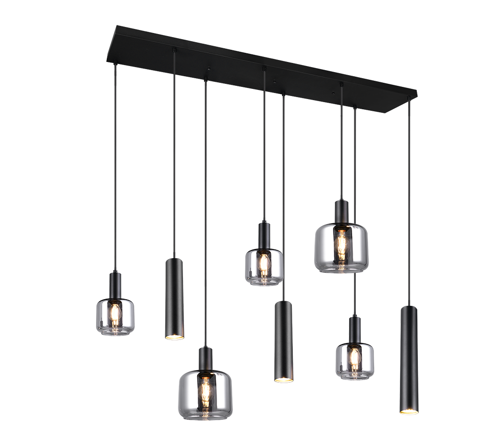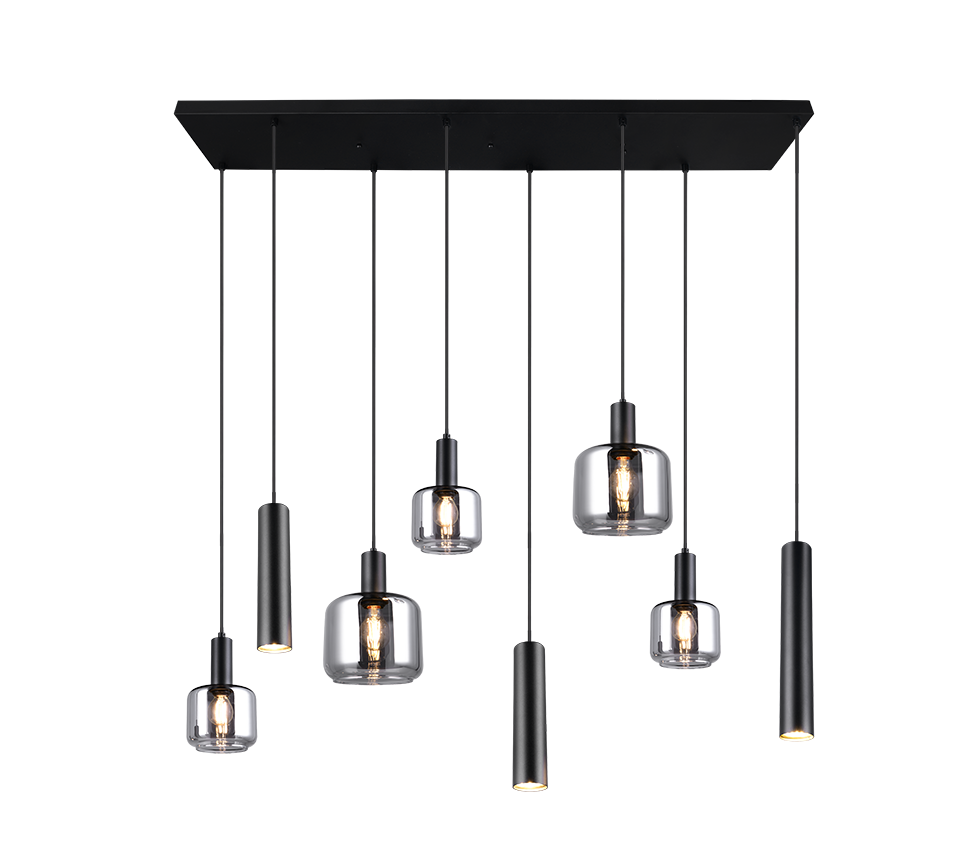 De moderne en elegante MATARO hanglamp met acht lichten maakt een geweldige indruk met zijn ontwerp. Door de combinatie van drie slanke metalen armaturen en vijf glazen elementen ontstaat er een unieke lichtverdeling en fascinerende reflecties in de ruimte. Deze lamp is niet alleen een verfraaiing voor je huis, maar ook een stijlvol statement boven elke eettafel. De matzwarte metalen afwerking en verchroomde glazen elementen geven de lamp een subtiele glans en lichtspiegeleffect. Het gebruik van energiezuinige LED-lichtbronnen wordt sterk aanbevolen voor deze lamp. LEDs zijn een ideaal alternatief voor traditionele halogeenlampen, bieden een hoge lichtkwaliteit, tot 80% energiebesparingen en hebben een lange levensduur met minimale warmteafgifte terwijl ze ook het milieu sparen.