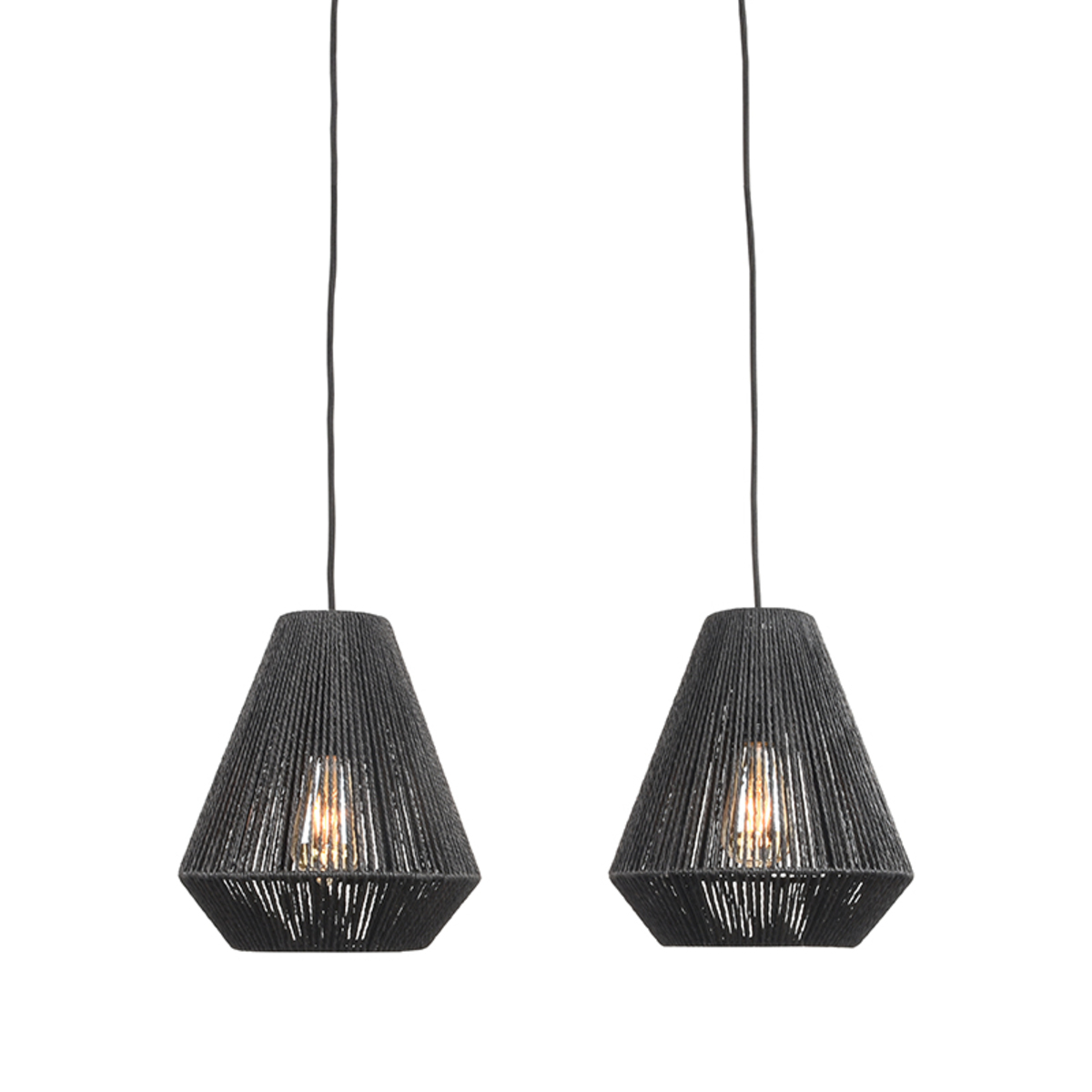 De LABEL51 Ibiza 2-lichts hanglamp is een lamp met karakter die een vleugje Ibiza in huis brengt, met een sfeervolle uitstraling. De lamp bestaat uit twee grote diamantvormige kappen van zwart jute gecombineerd met robuust zwart metaal. Deze unieke mix zorgt voor een stijlvolle twist en creëert een warme en huiselijke sfeer.