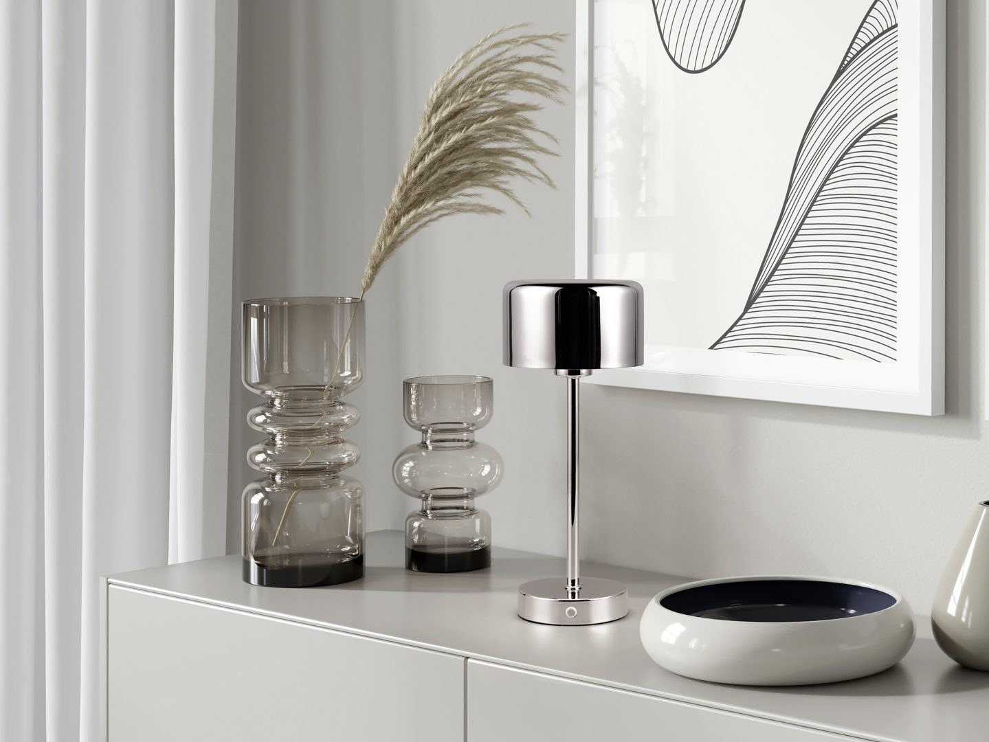 De draadloze oplaadbare lamp JEFF is multifunctioneel en elegant, perfect als charmante tafellamp of stijlvolle verlichting in de slaapkamer. Met een modern en tijdloos ontwerp past deze lamp bij elke interieurstijl. De lamp heeft een 3-staps touchdimmer en biedt tot 12 uur niet-verblindend licht. Het chroom metalen ontwerp voegt een moderne touch toe aan je interieur. Met LED-technologie is de lamp energiezuinig en heeft een lange levensduur. Bespaar tot 80% op energiekosten in vergelijking met halogeenlampen en zorg voor een milieuvriendelijke verlichtingsoptie.