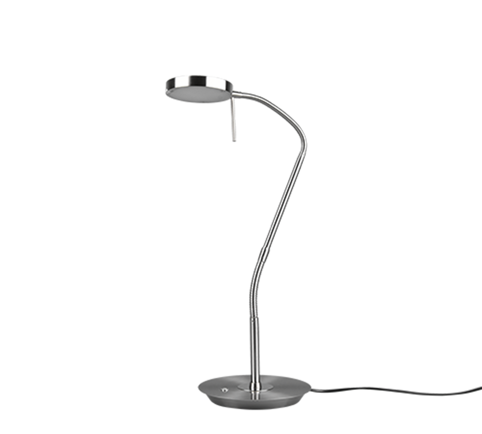 Trio, tafellamp, Monza inclusief 1 x LED, SMD, 12,0 watt, 2300+3000+4000K, 1400 Lm. Gemaakt van kunststof in de kleur zwart met een metalen, matnikkel armatuur. Afmetingen: L:19,0 cm, B:46,0 cm, H:57,0 cm. Geïntegreerde dimmer, aanraakdimmer, instelbare lichttemperatuur, flexibel, geheugenfunctie, IP20.