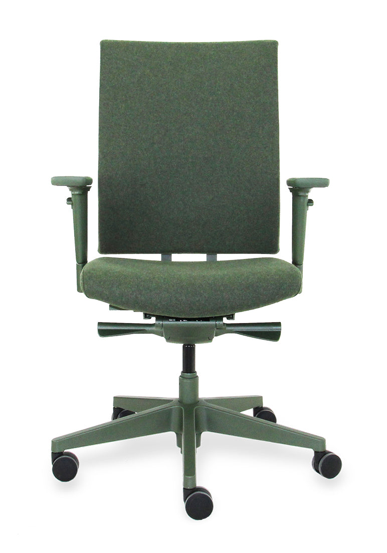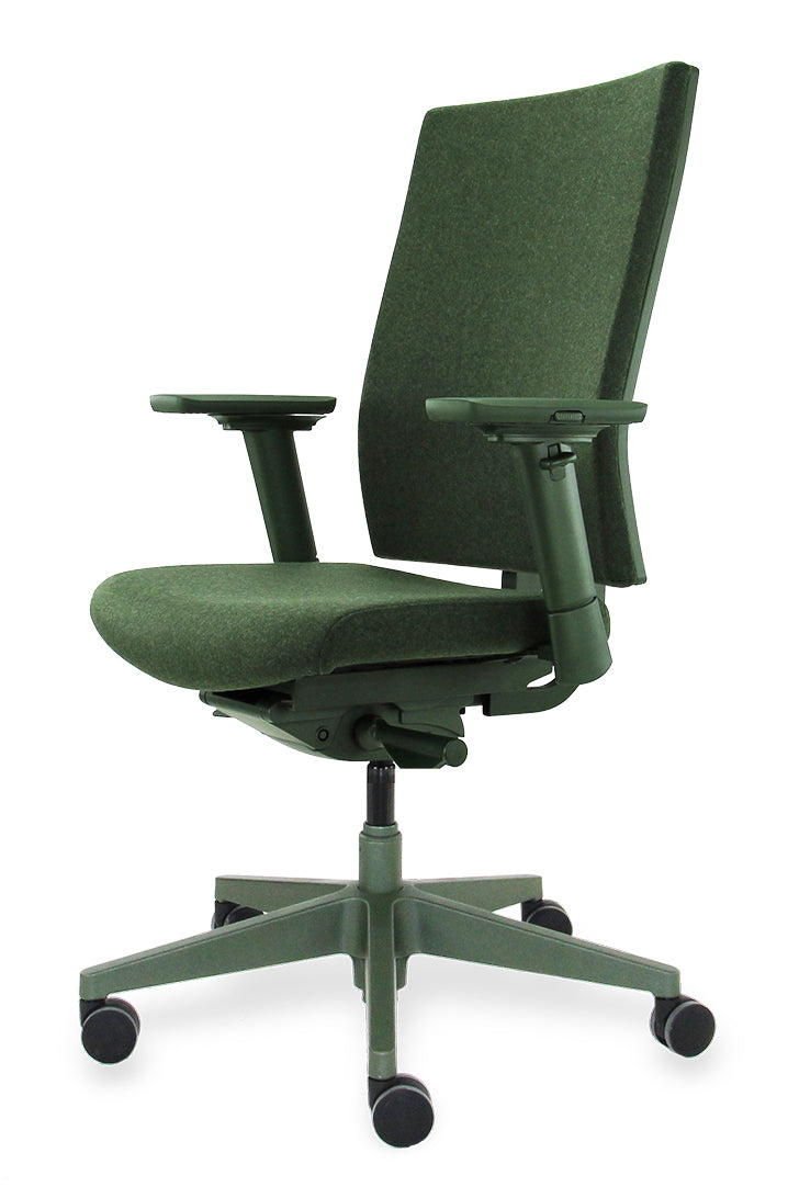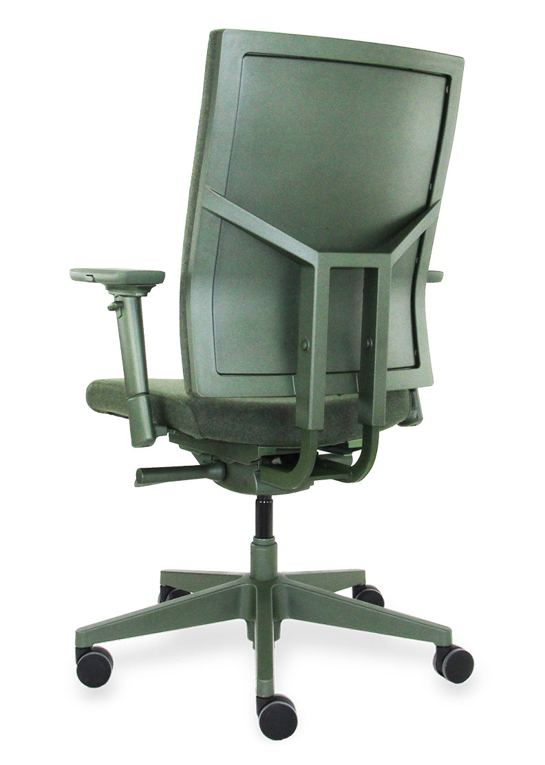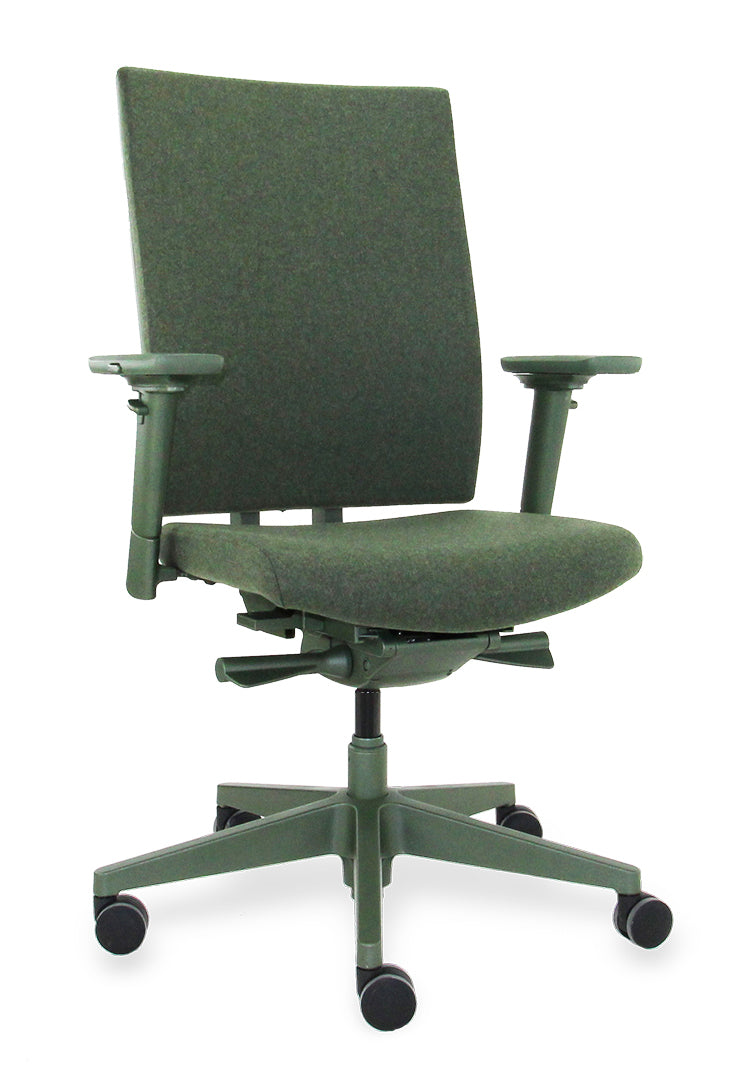 [Image description: Workliving Zuidas Comfort bureaustoel in olijfgroen met gerecyclede wolstoffering.]