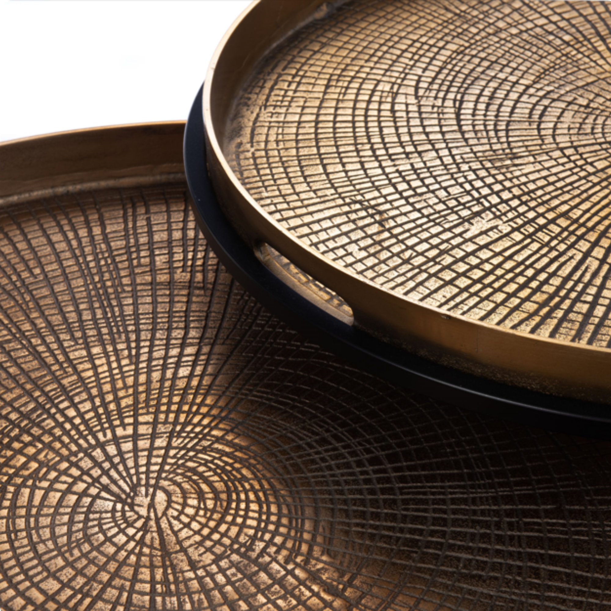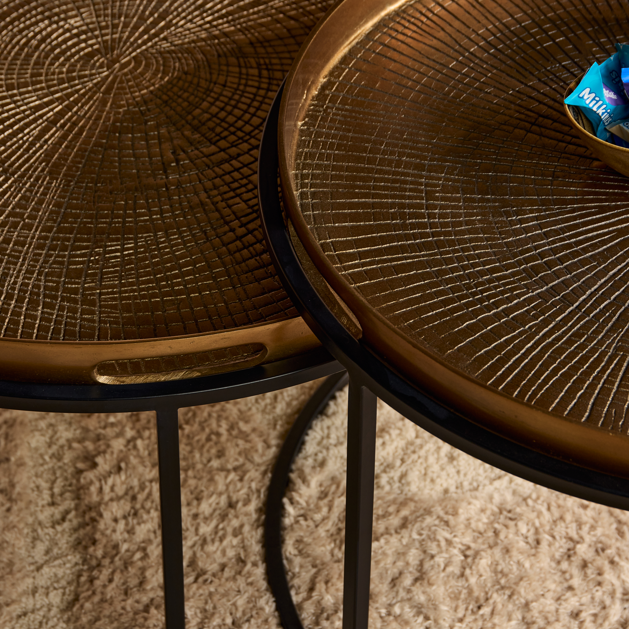 De Julie salontafelset bestaat uit twee tafels met een elegant en handig design. De tafelbladen zijn vervaardigd uit aluminium met een chique koperen afwerking, wat zorgt voor een warme en luxe uitstraling. Dit duo aan tafels is perfect voor zowel compacte als ruime kamers.