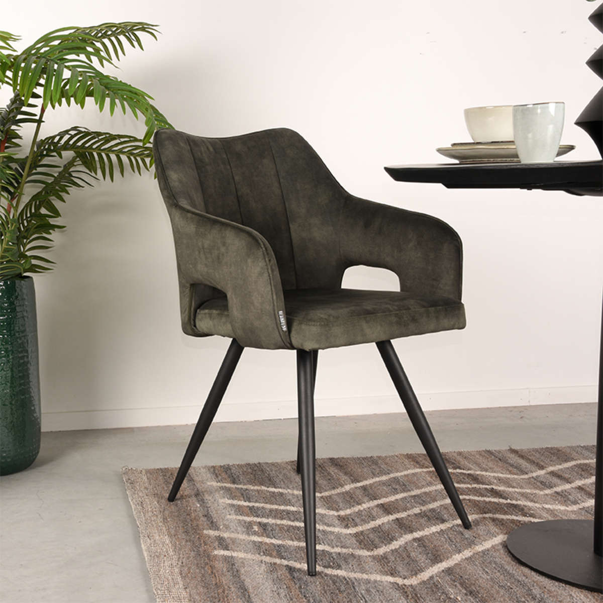 Noud is bekleed met hunter velours, een zachte en luxueuze stof om heerlijk aan te raken. Met een vierkante zitting en rugleuning met elegante rondingen en een subtiele curve, voegt Noud stijl toe aan elke ruimte. De rugleuning is voorzien van drie verticale stiksels die vier banen vormen, en de buitenrand van de armleuningen naar de rugleuning is gedetailleerd met luxe piping. De speelse armleuningen met een luchtige ronde uitsparing bieden extra comfort. De naar buiten gerichte zwarte poten zorgen ervoor dat de stoel stevig op de grond staat en geven een leuk speels tintje.